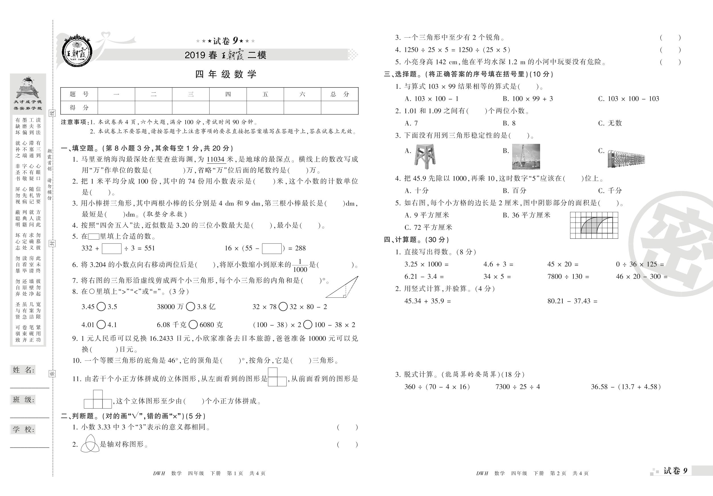 王朝霞期末模拟卷四年级下册数学(人教版)_R210804150318【9】