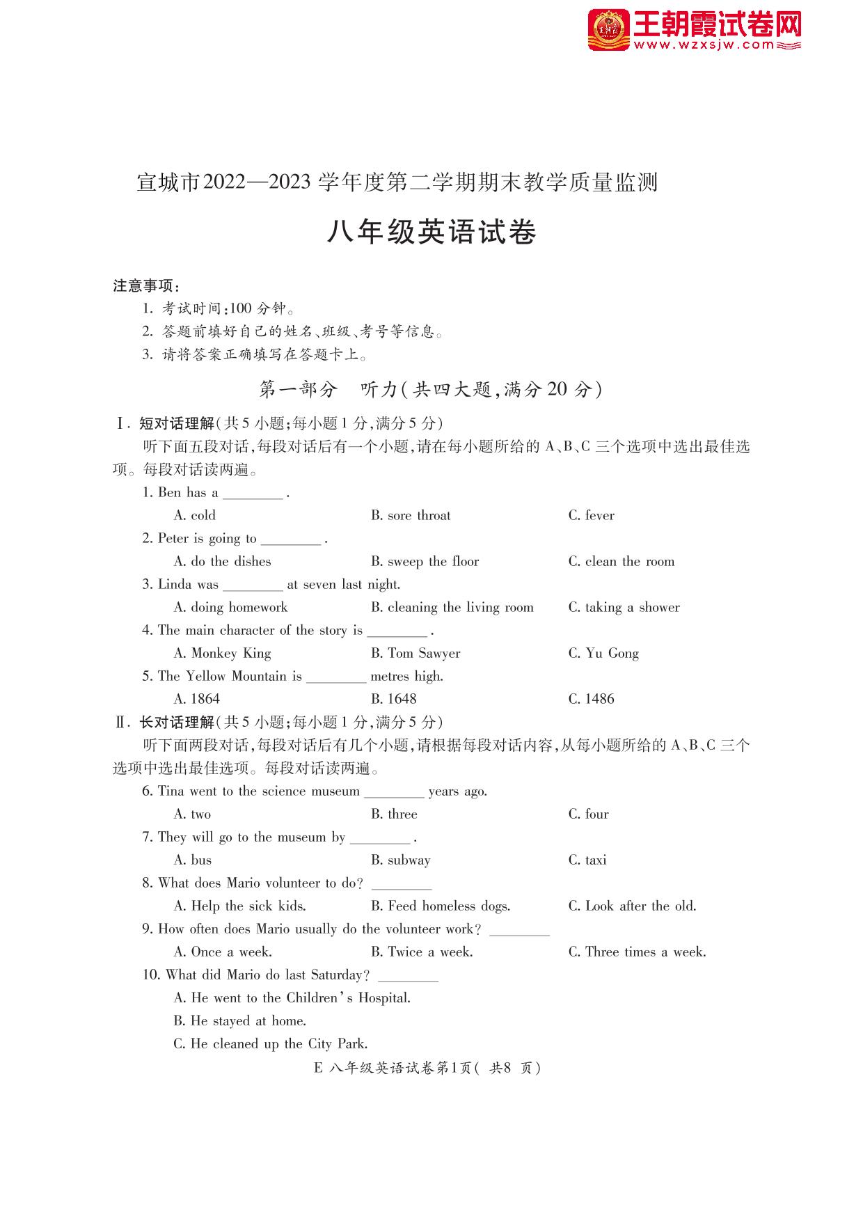 安徽省宣城市2022-2023学年度第二学期期末教学质量监测八年级英语(人教版)