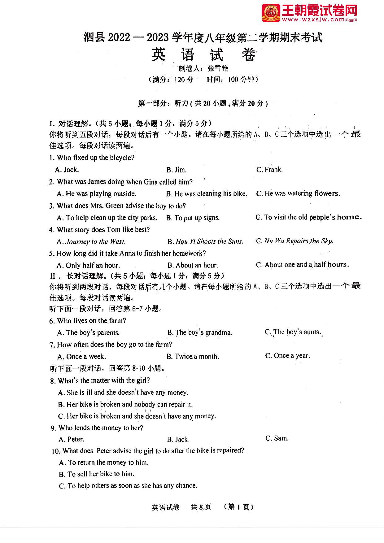 安徽省宿州市泗县2022-2023学年度第二学期期末考试八年级英语(人教版)【无听力音频】