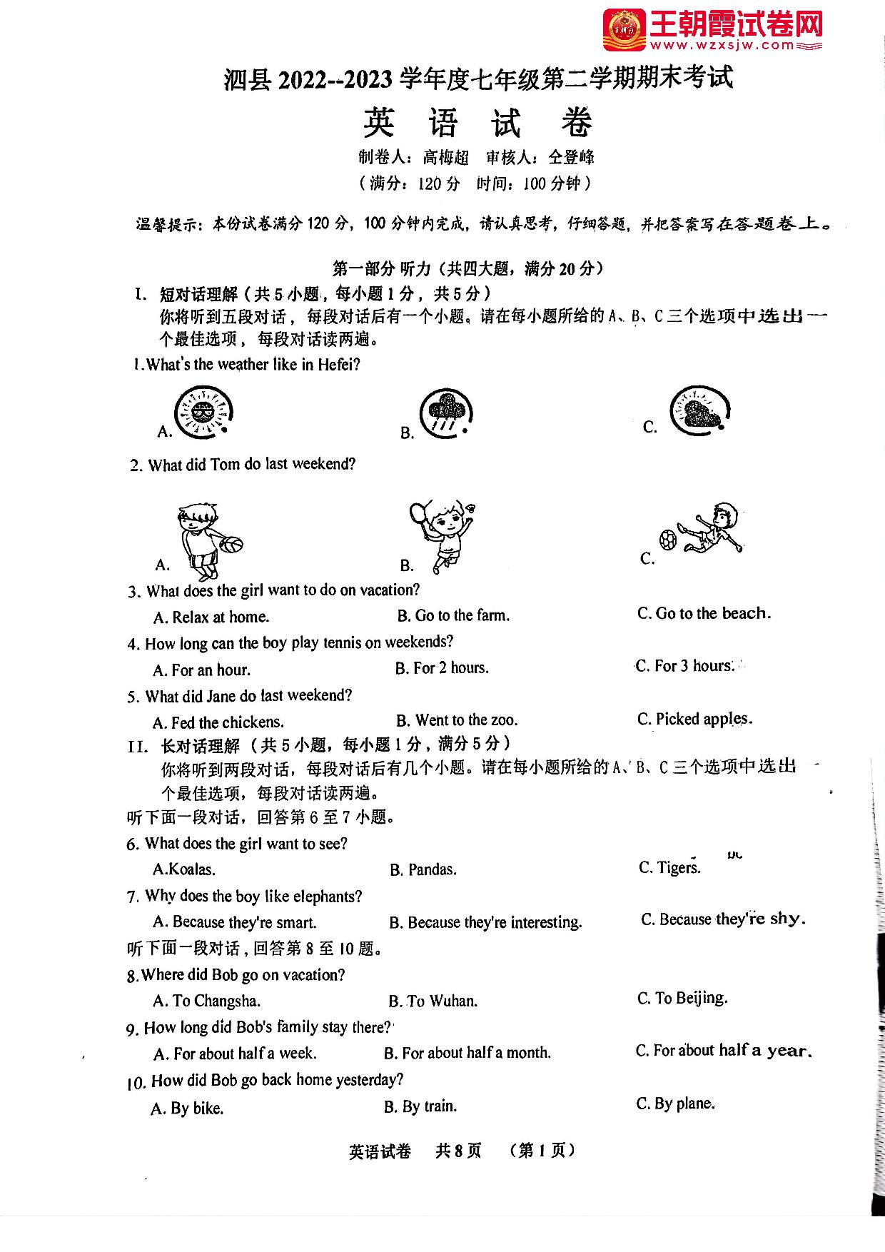 安徽省宿州市泗县2022-2023学年度第二学期期末考试七年级英语(人教版)【无听力音频】