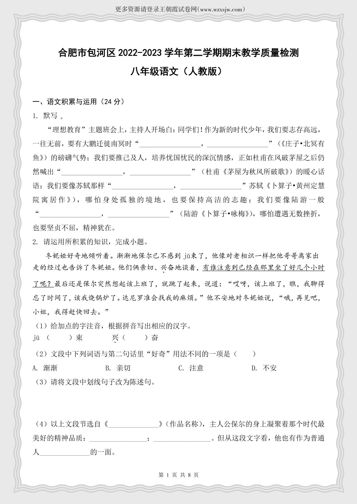 安徽省合肥市包河区2022-2023学年第二学期期末教学质量检测八年级语文(人教版)