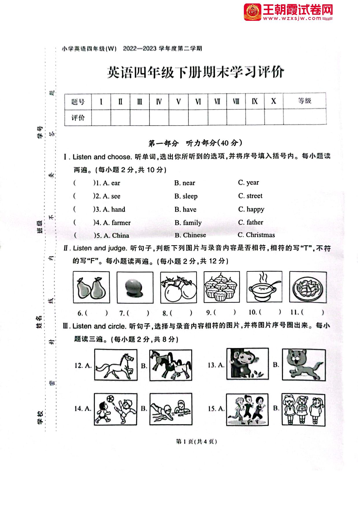 四年级英语外研版(三起始)下册期末卷
