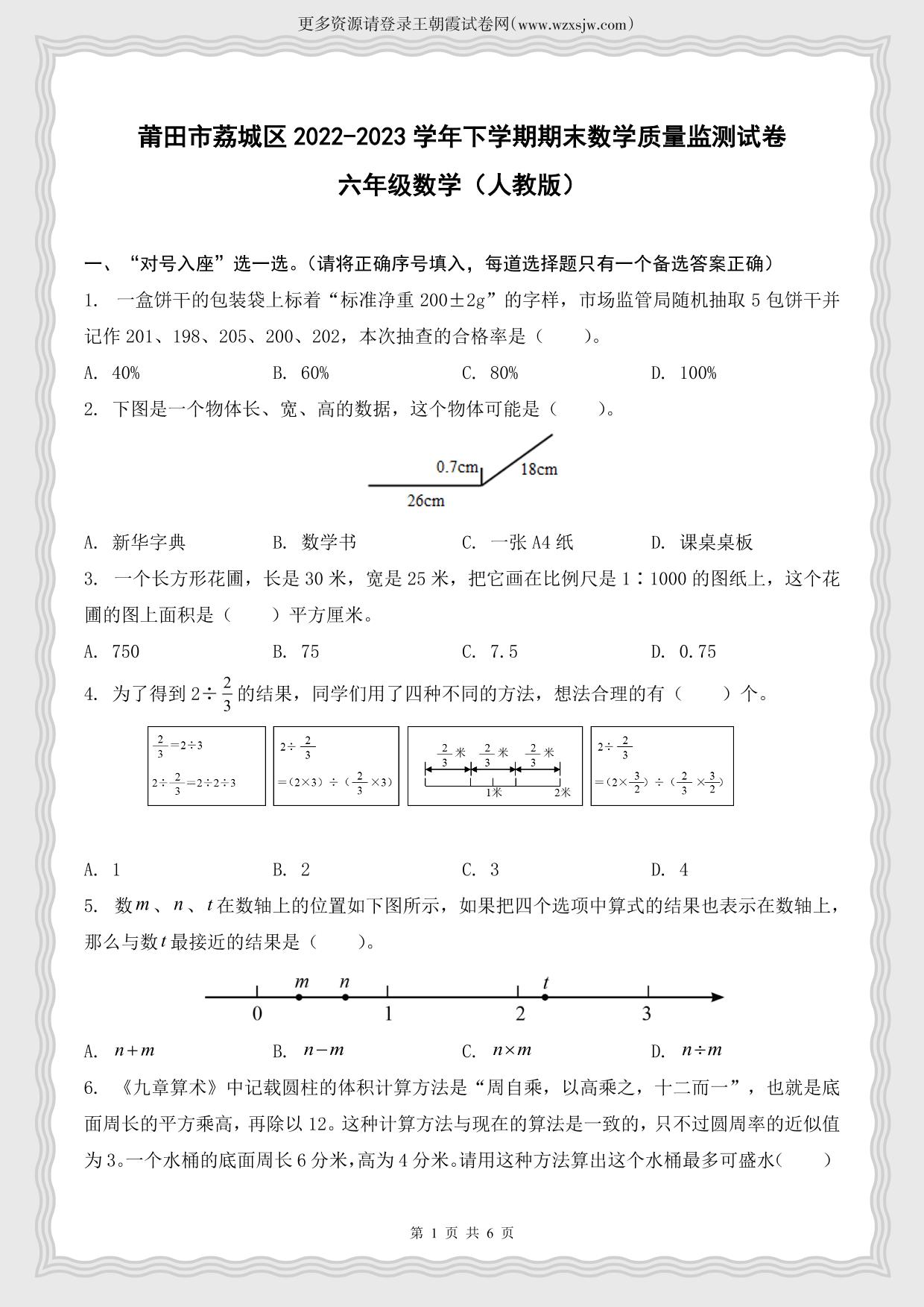 福建省莆田市荔城区2022-2023学年下学期期末质量监测试卷六年级数学(人教版)