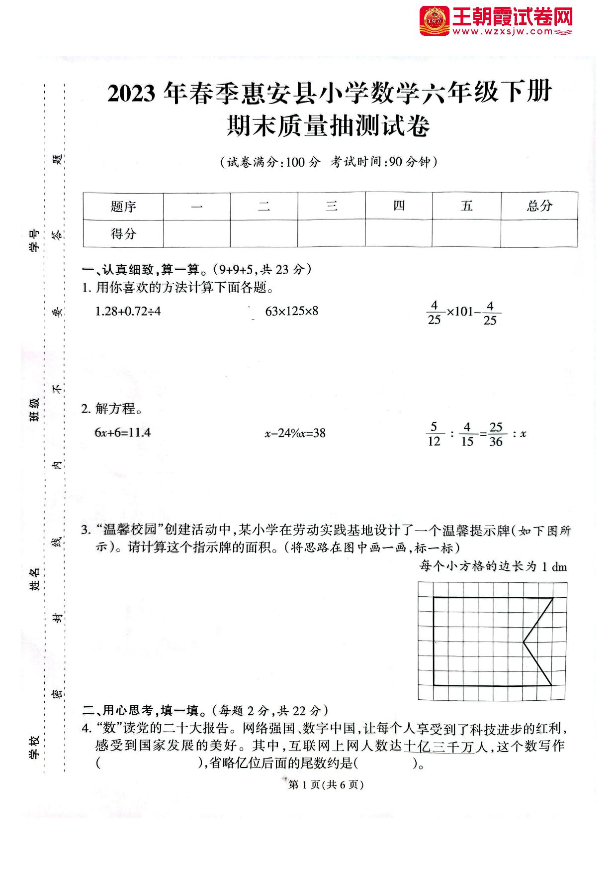 福建省泉州市惠安县2022-2023学年下册期末质量抽测试卷六年级数学(北师版)