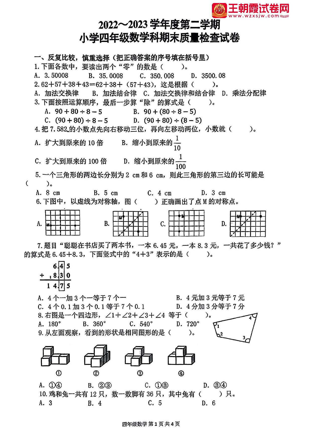 四年级数学人教版下册期末卷