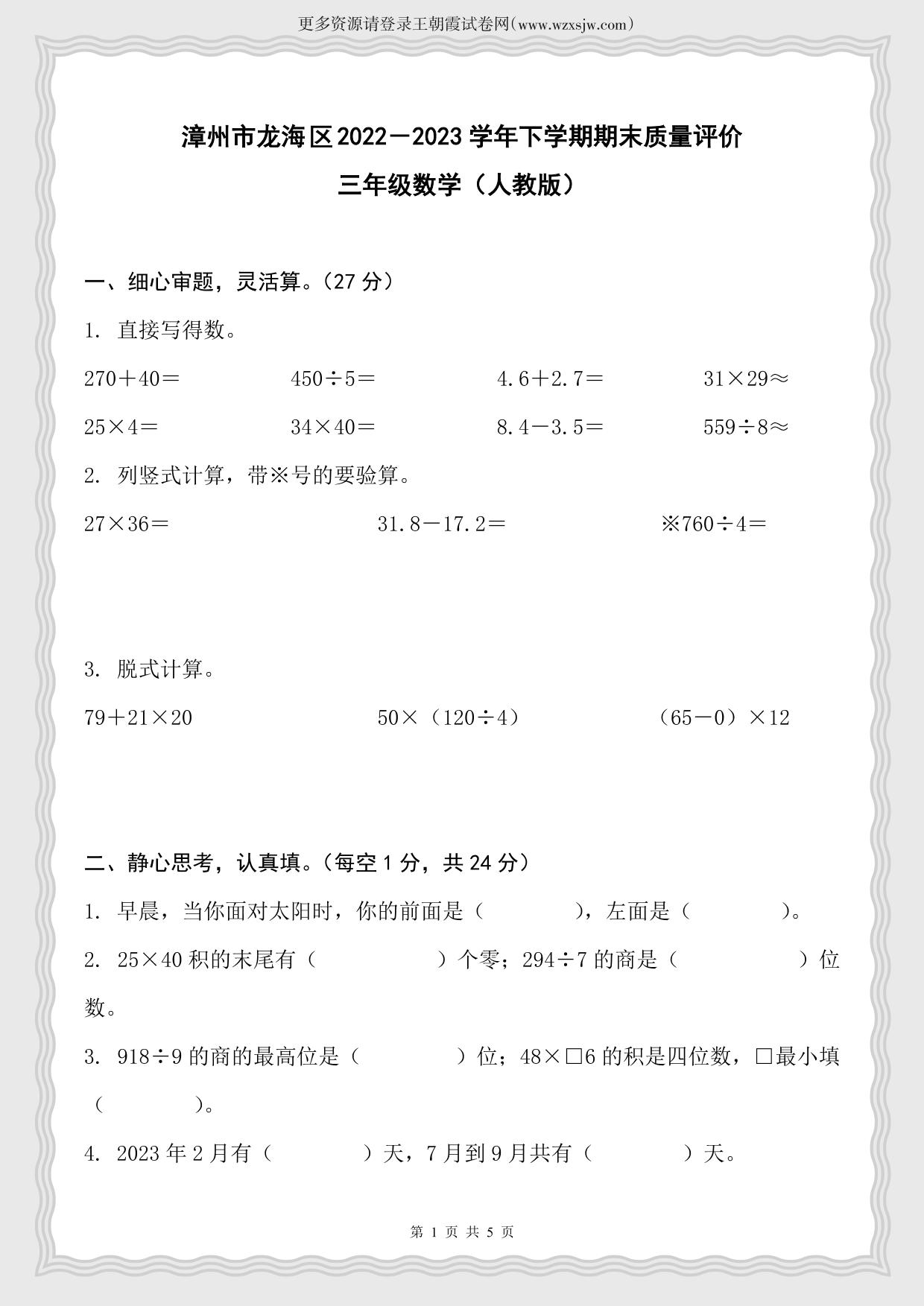 福建省漳州市龙海区2022-2023学年下学期期末质量评价三年级数学(人教版)
