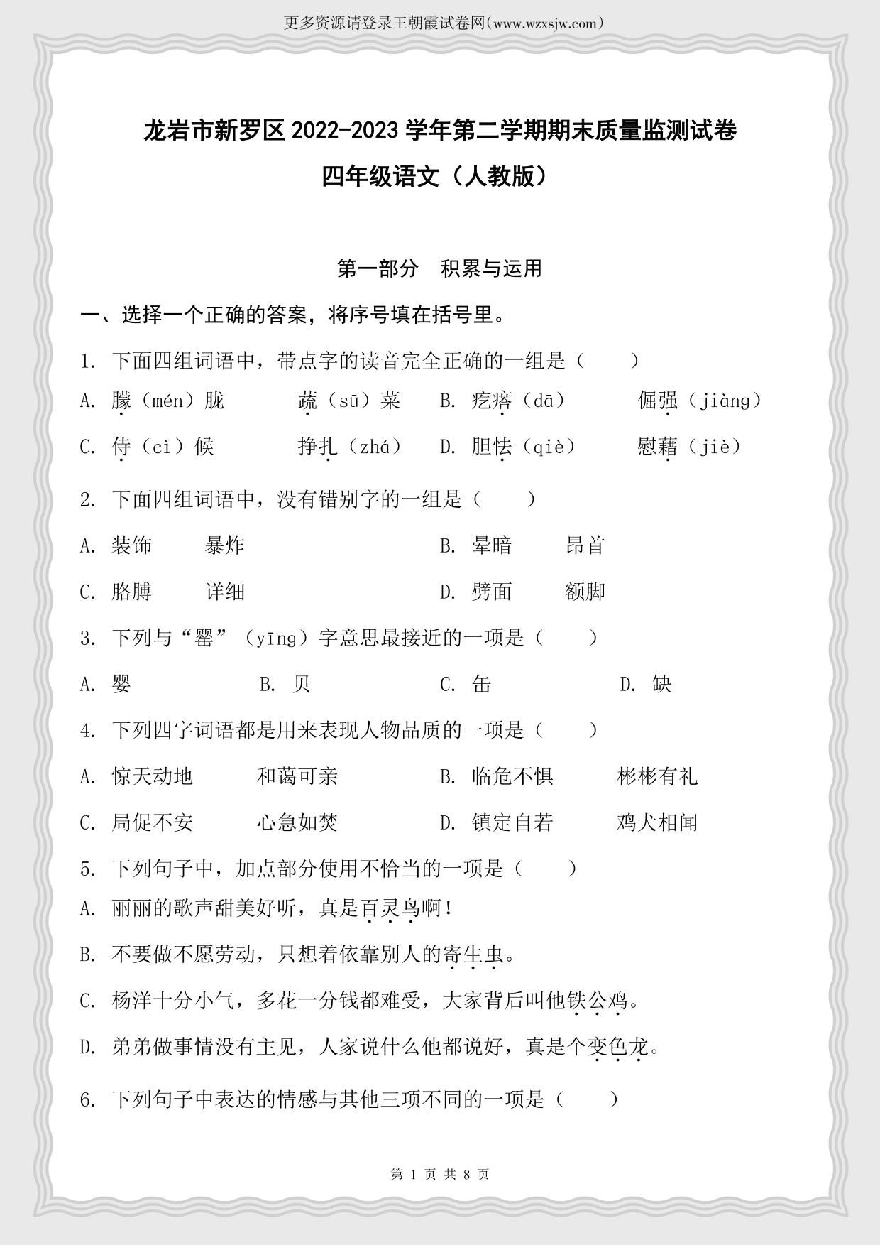 福建省龙岩市新罗区2022-2023学年第二学期期末质量检测试卷四年级语文(人教版)