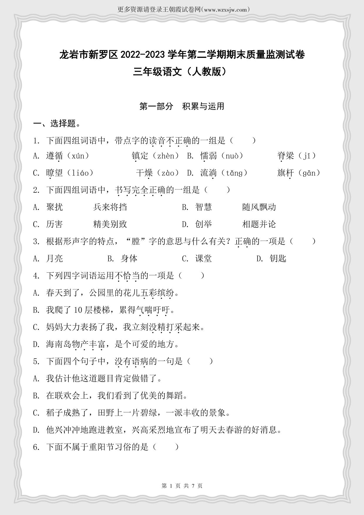 福建省龙岩市新罗区2022-2023学年第二学期期末质量检测试卷三年级语文(人教版)