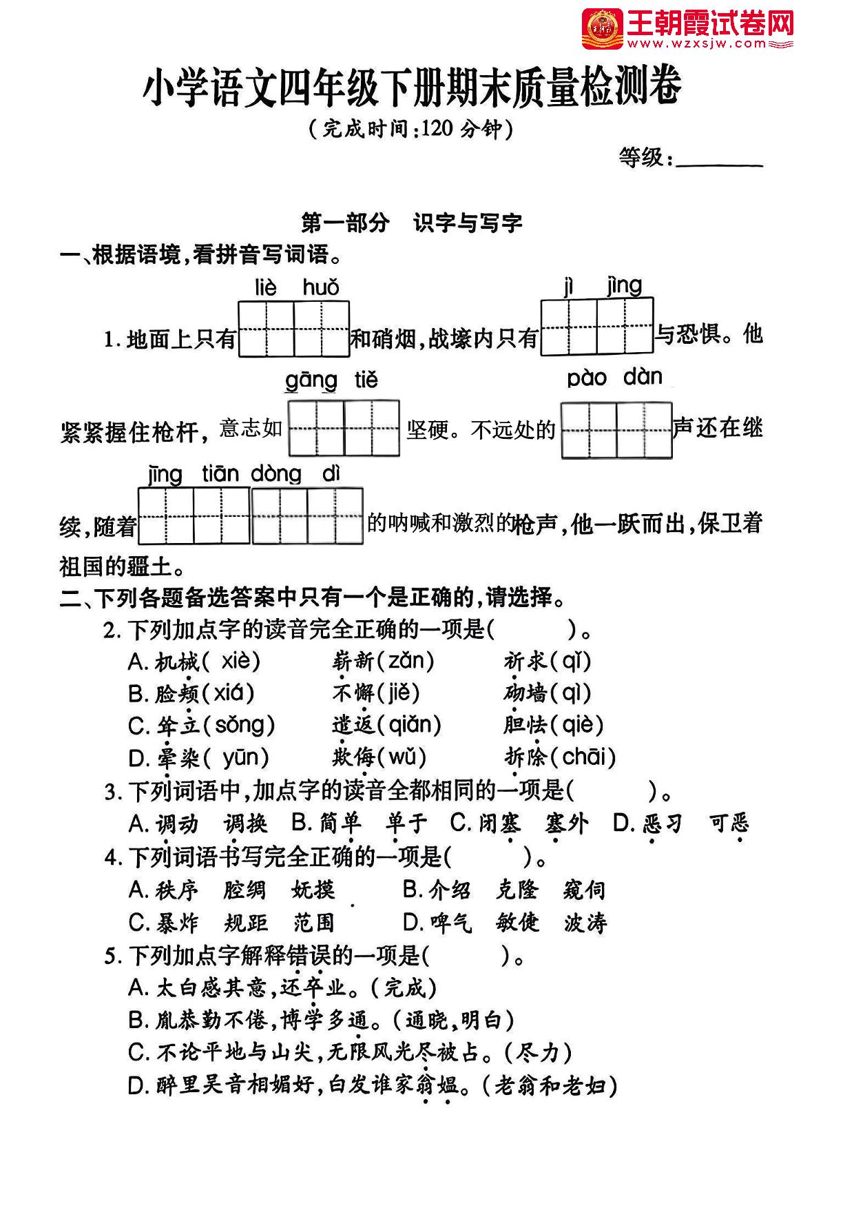 四年级语文人教版下册期末卷