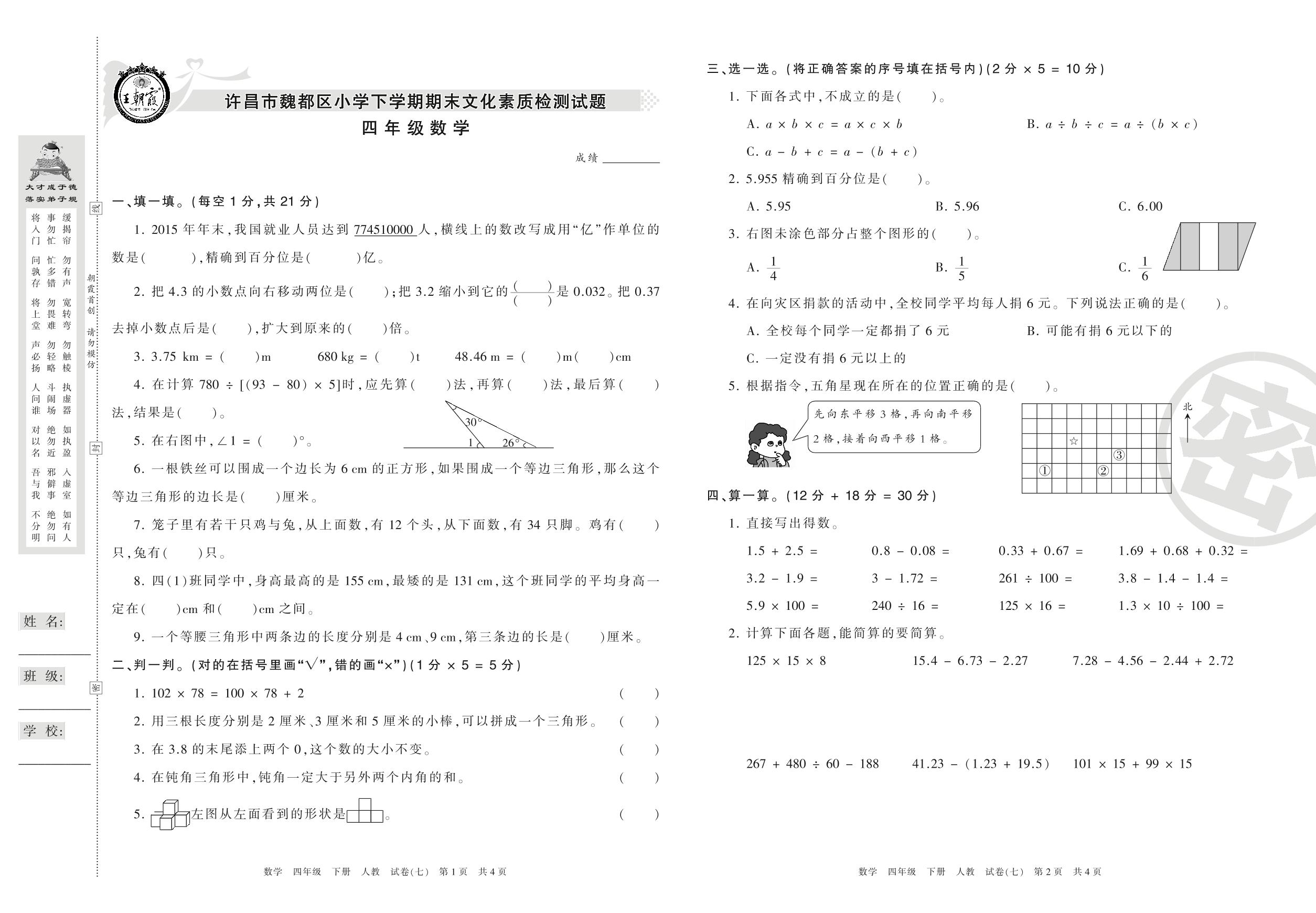 2015-2016学年第二学期许昌市魏都区四年级数学试卷(人教版)【7】