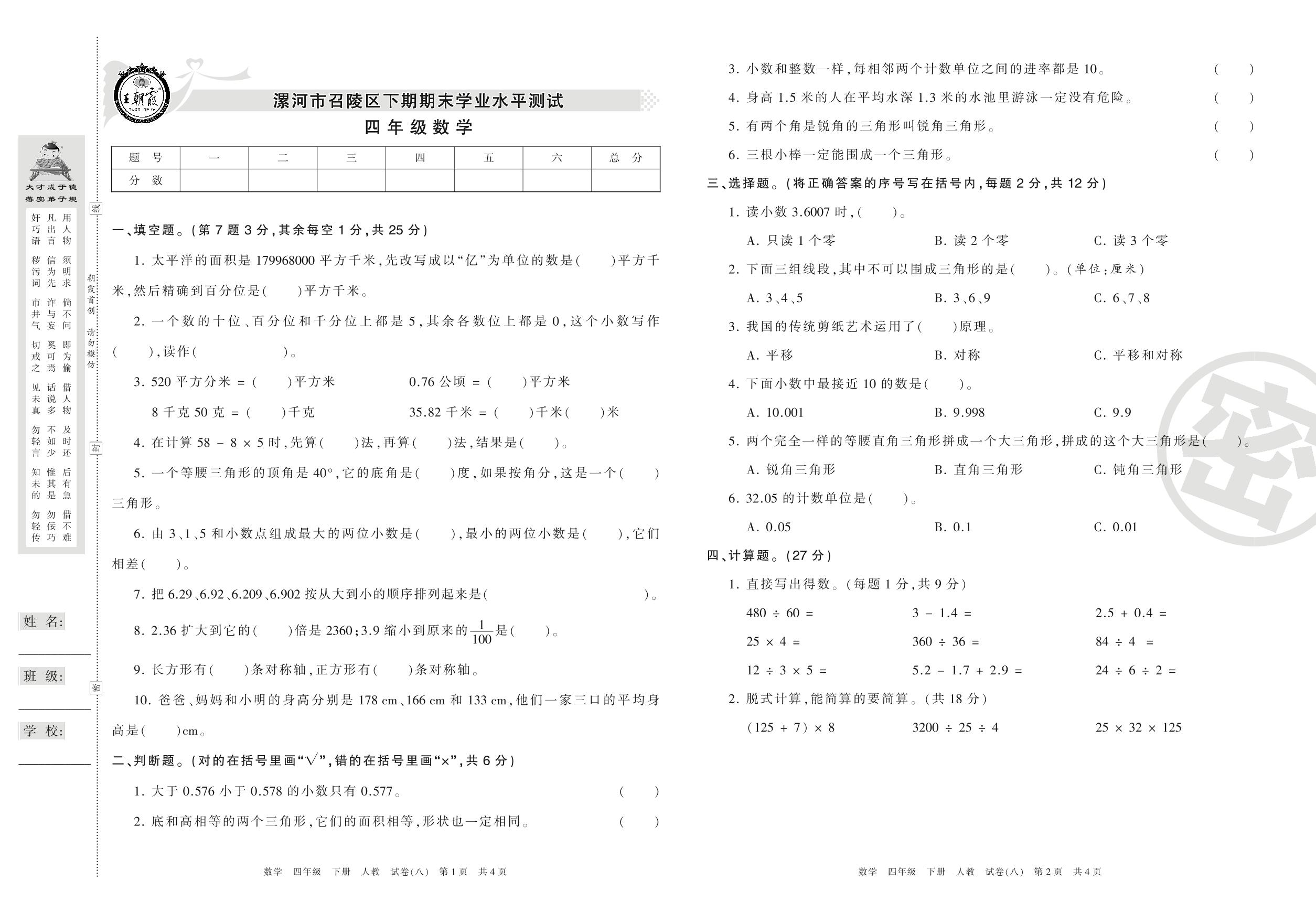 2015-2016学年第二学期漯河市召陵区四年级数学试卷(人教版)【8】
