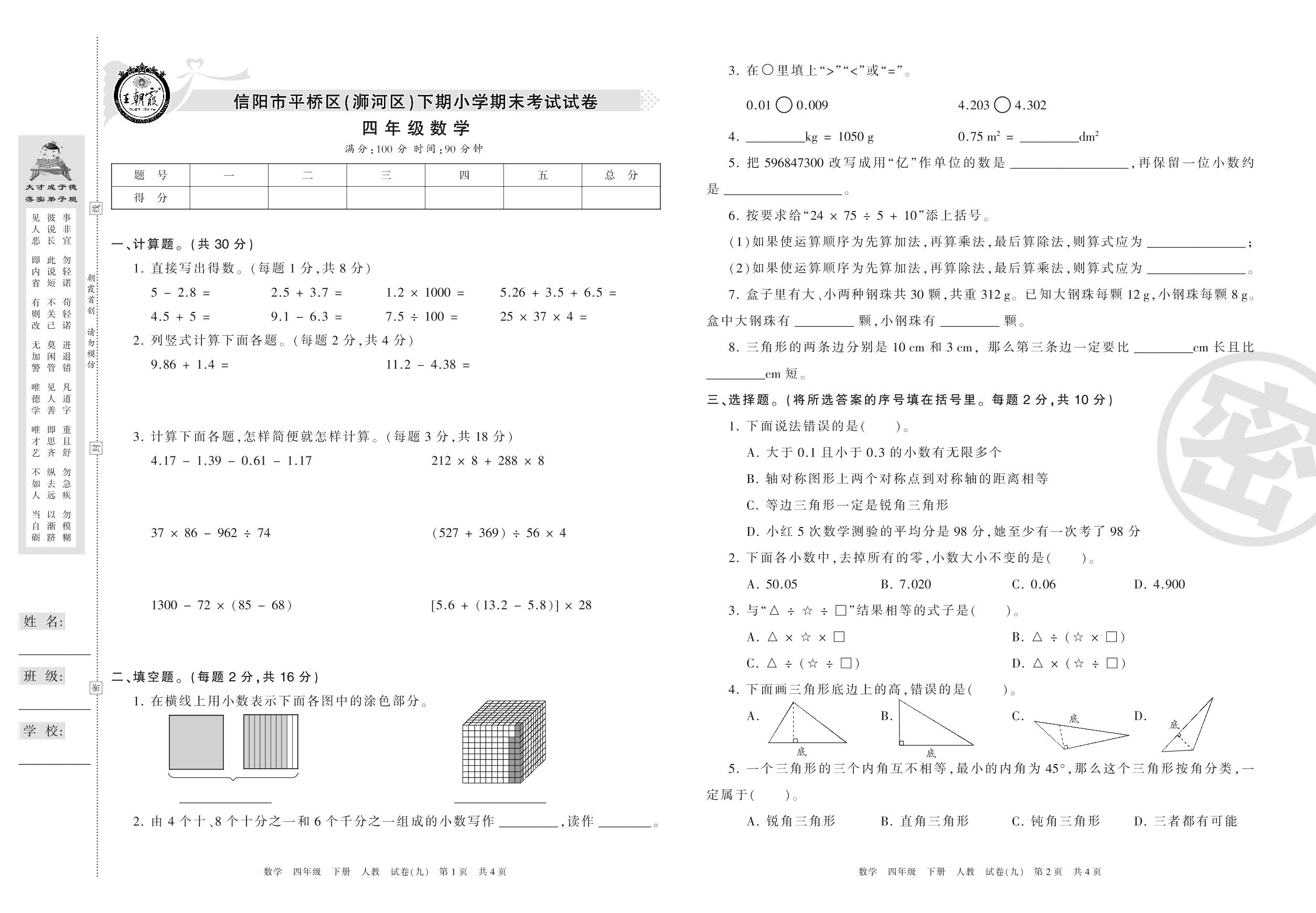 2015-2016学年第二学期信阳市平桥区(浉河区)四年级数学试卷(人教版)【9】