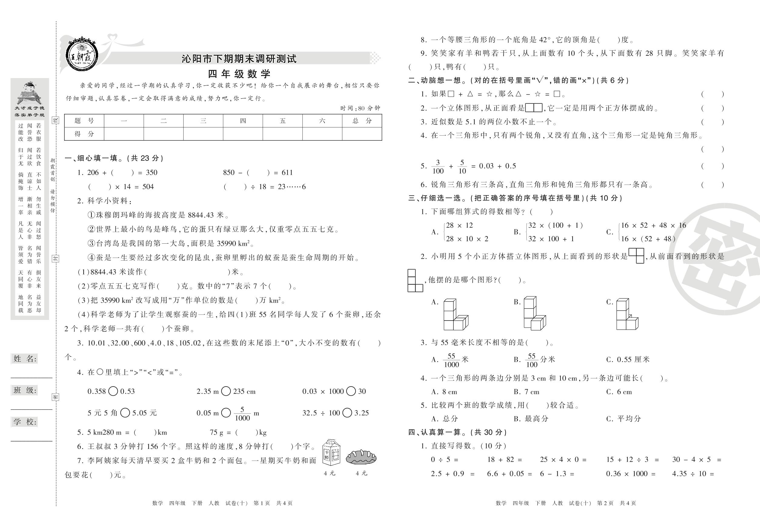 2015-2016学年第二学期沁阳市四年级数学试卷(人教版)【10】