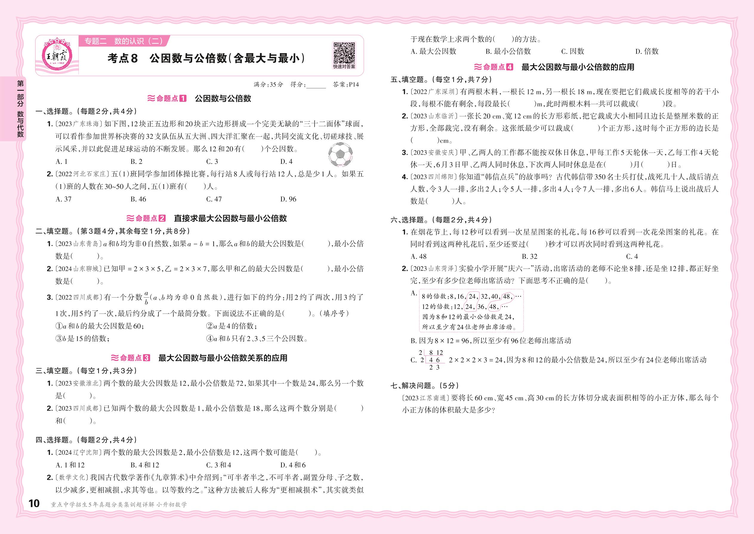 小升初数学·【5年真题分类集训】专题二 数的认识(二):考点8 公因数与公倍数(含最大与最小)