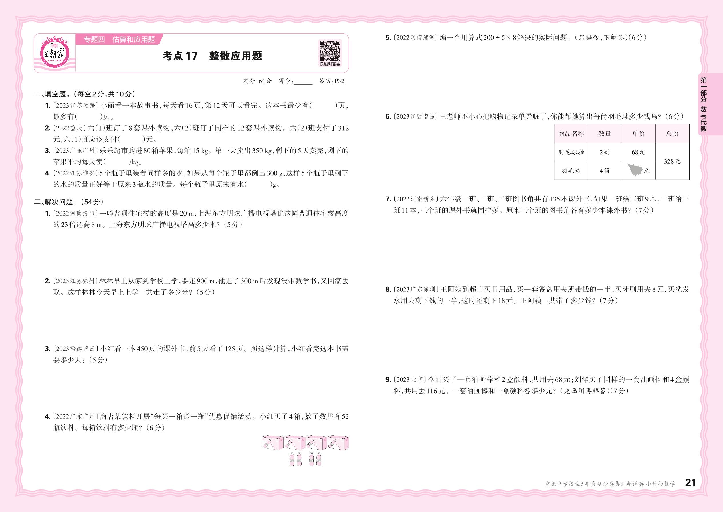 小升初数学·【5年真题分类集训】专题四 估算和应用题:考点17 整数应用题