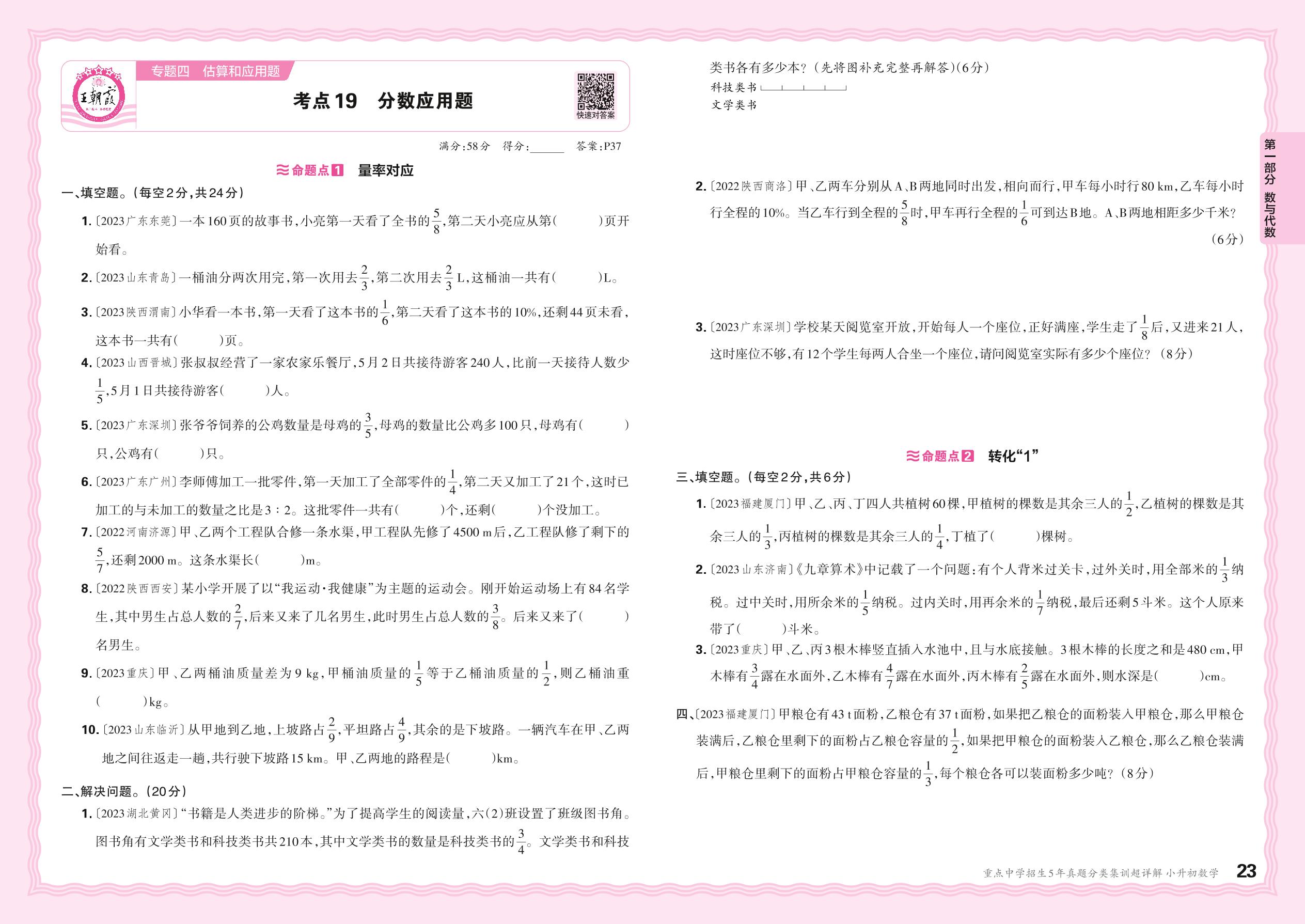 小升初数学·【5年真题分类集训】专题四 估算和应用题:考点19 分数应用题