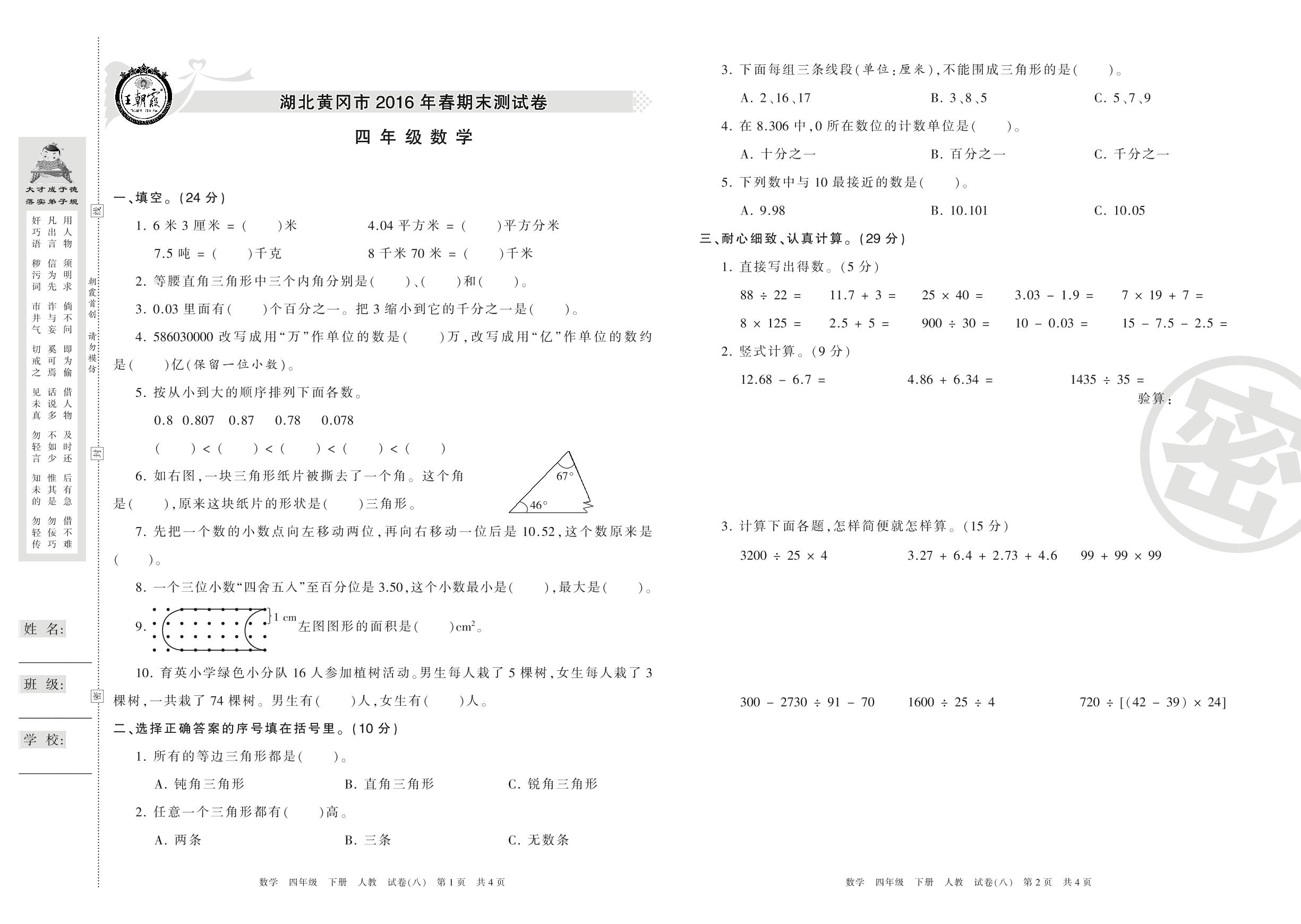 2015-2016学年第二学期湖北黄冈市四年级数学试卷(人教版)【8】