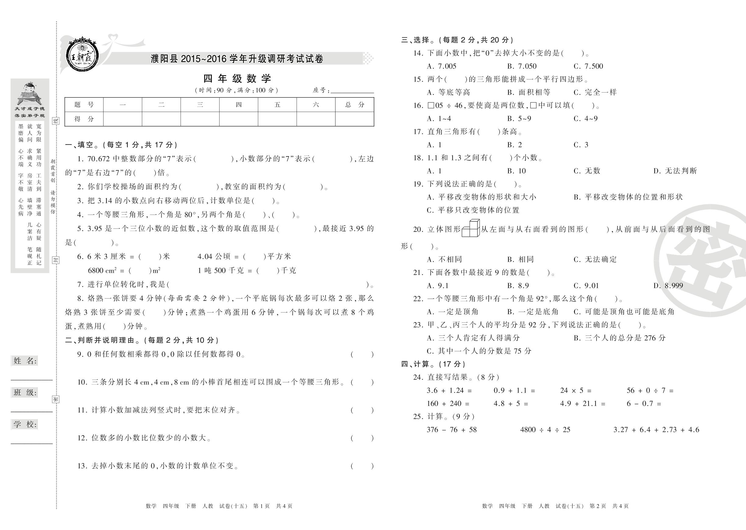 2015-2016学年第二学期濮阳市濮阳县四年级数学试卷(人教版)【15】