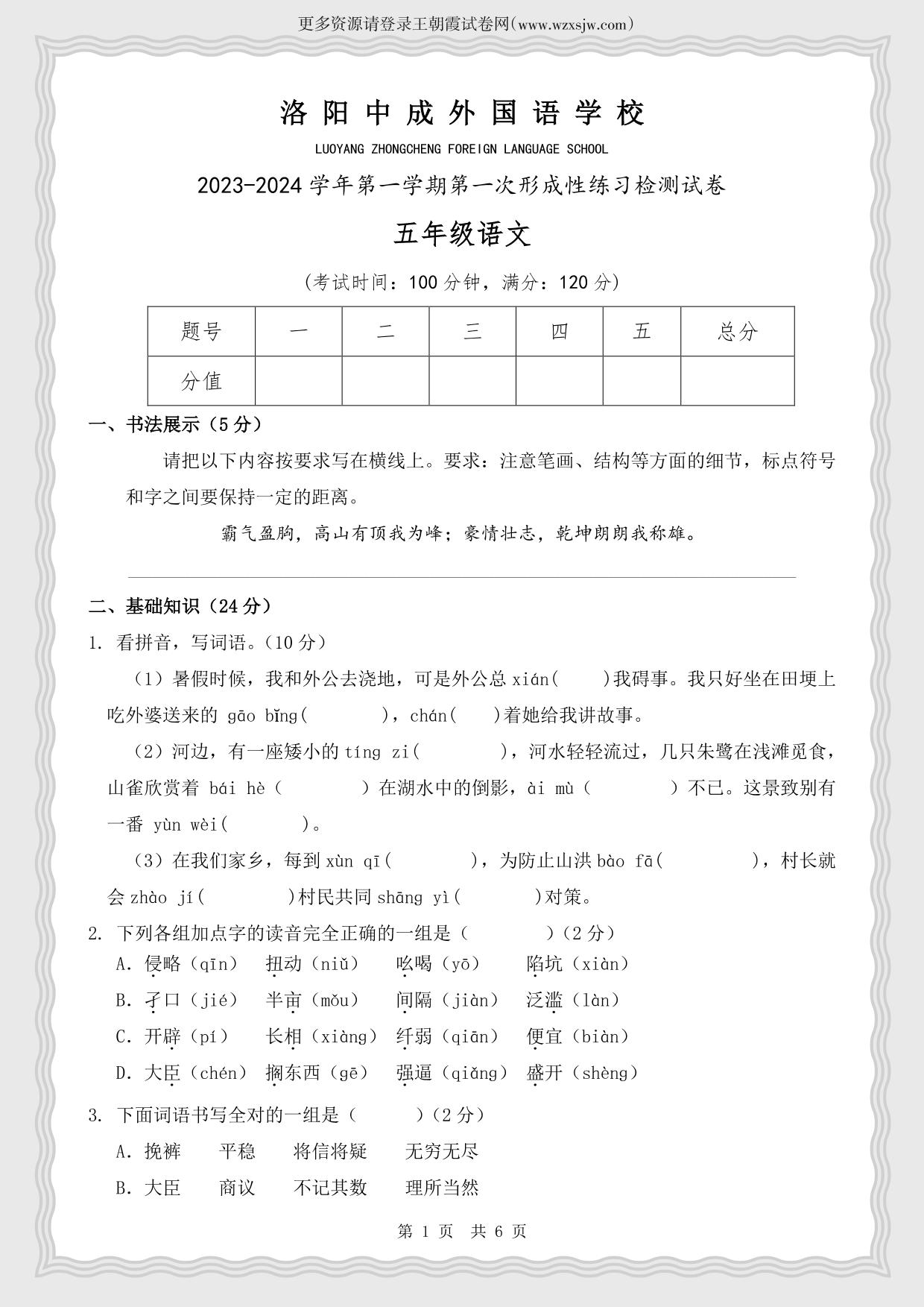 河南省洛阳市偃师区中成外国语学校2023-2024学年第一学期第一次形成性练习检测月考试卷五年级语文(人教版)