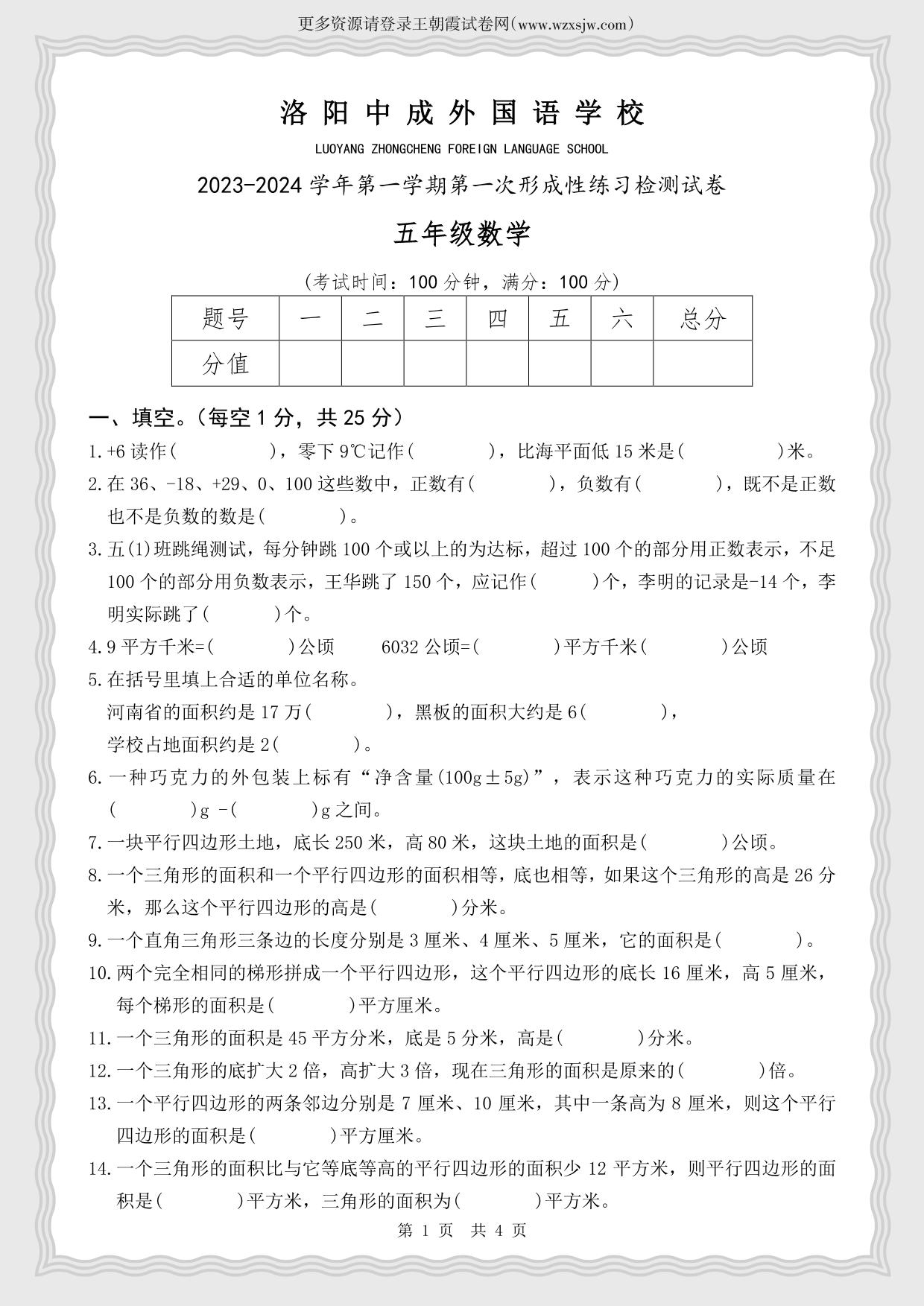 河南省洛阳市偃师区中成外国语学校2023-2024学年第一学期第一次形成性练习检测月考试卷五年级数学(苏教版)