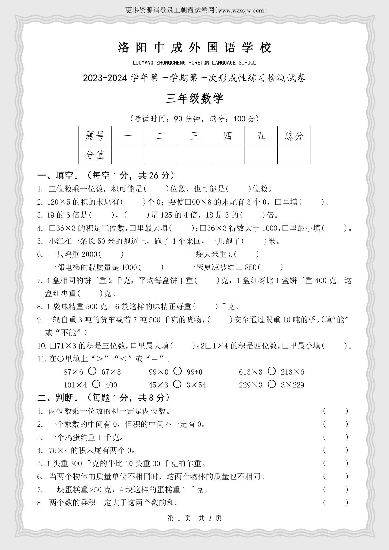 河南省洛阳市偃师区中成外国语学校2023-2024学年第一学期第一次形成性练习检测月考试卷三年级数学(苏教版)
