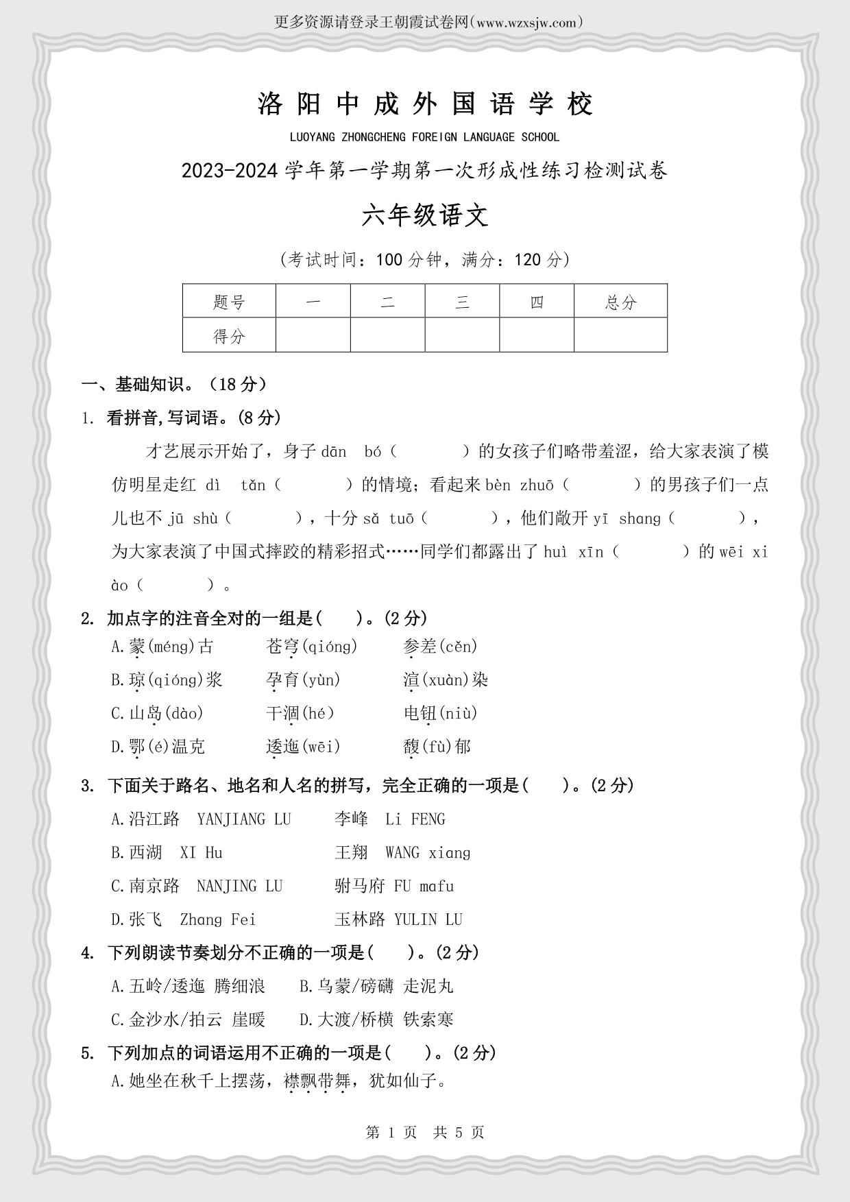 河南省洛阳市偃师区中成外国语学校2023-2024学年第一学期第一次形成性练习检测月考试卷六年级语文(人教版)