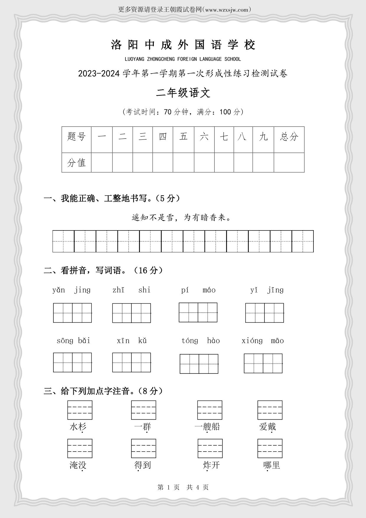 河南省洛阳市偃师区中成外国语学校2023-2024学年第一学期第一次形成性练习检测月考试卷二年级语文(人教版)