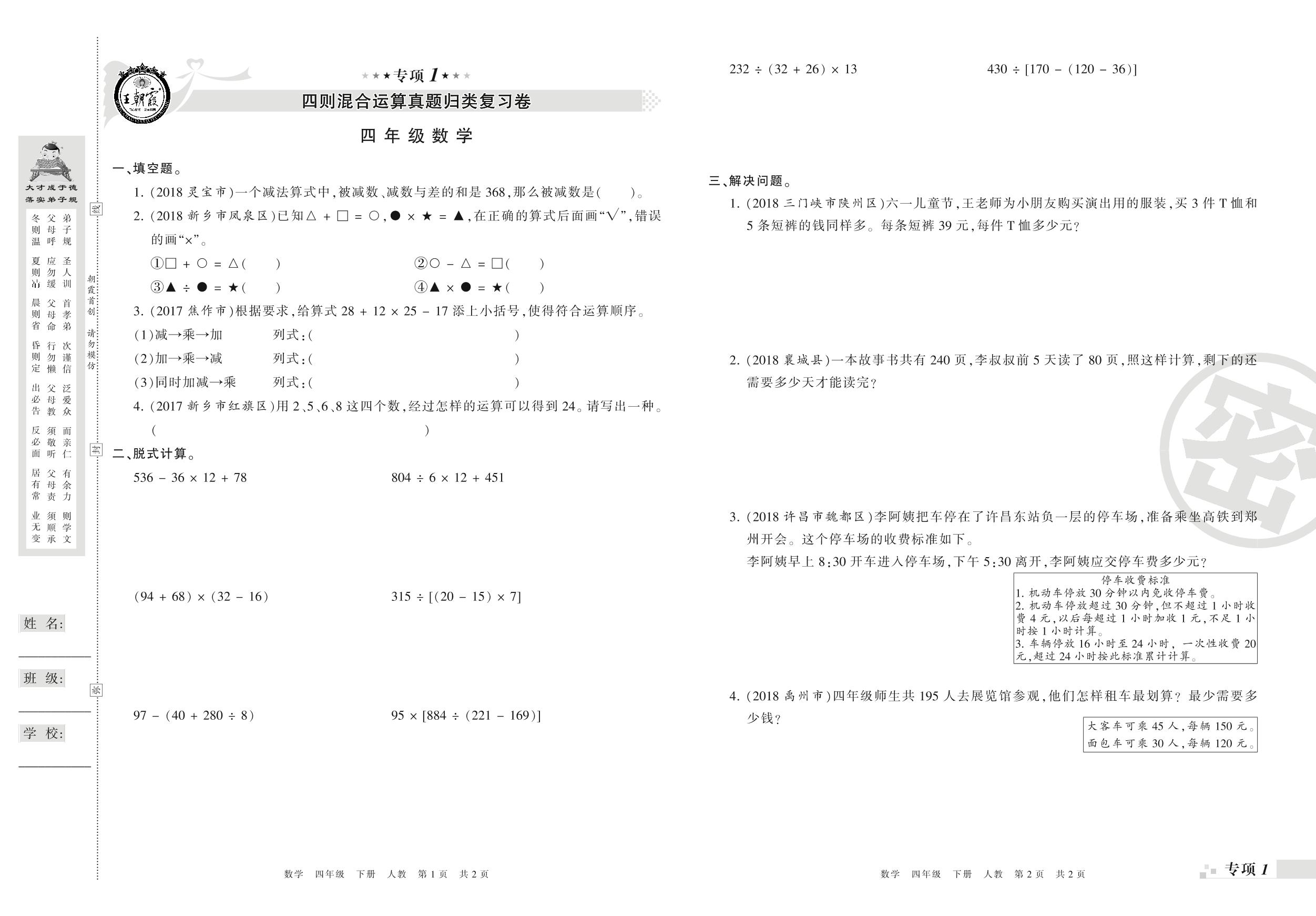 王朝霞期末专项卷——四则混合运算、运算定律真题归类复习卷四年级下册数学(人教版)_R210804150609【0】