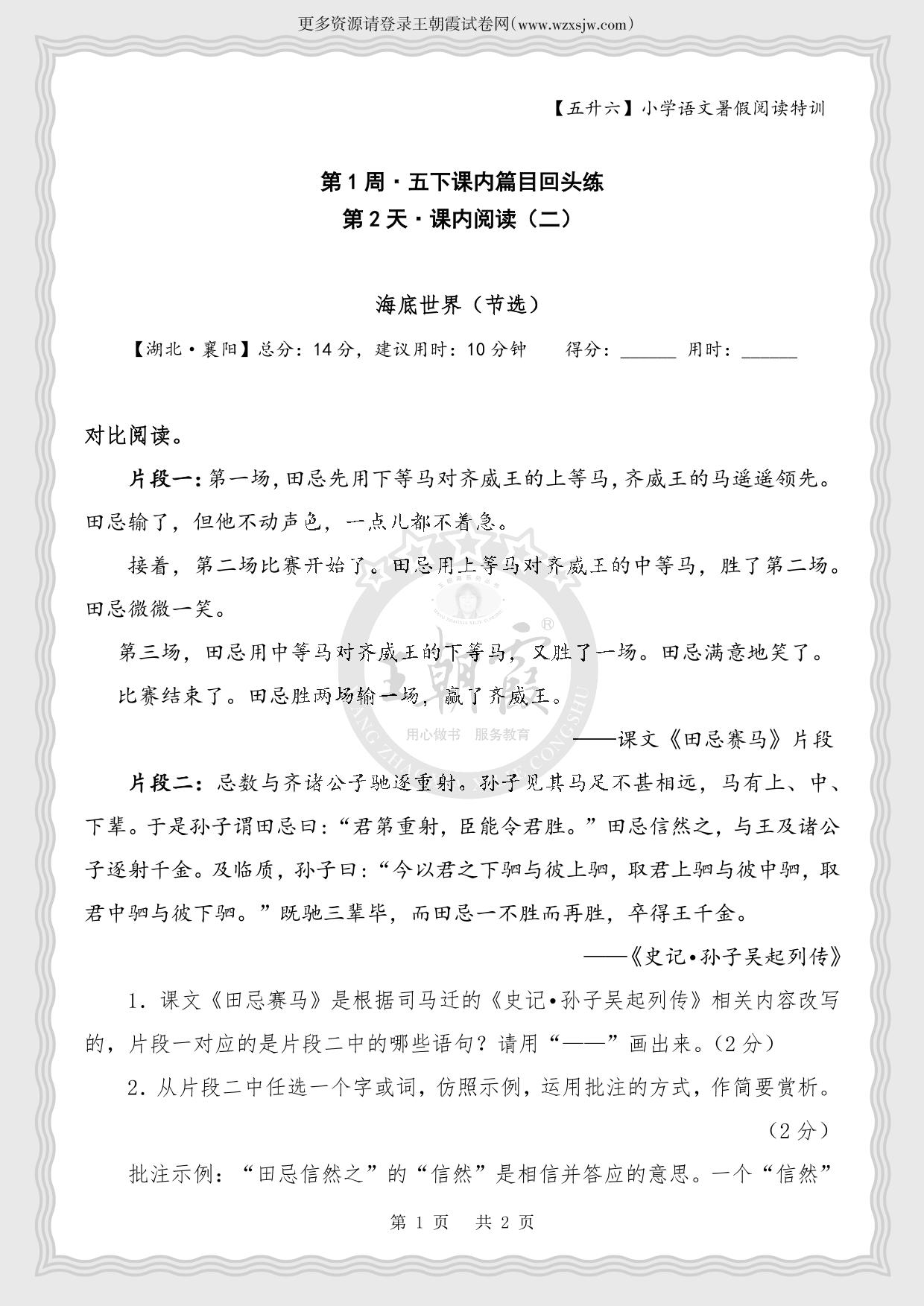【五升六】小学语文暑假阅读特训第1周第2天 课内阅读(二)