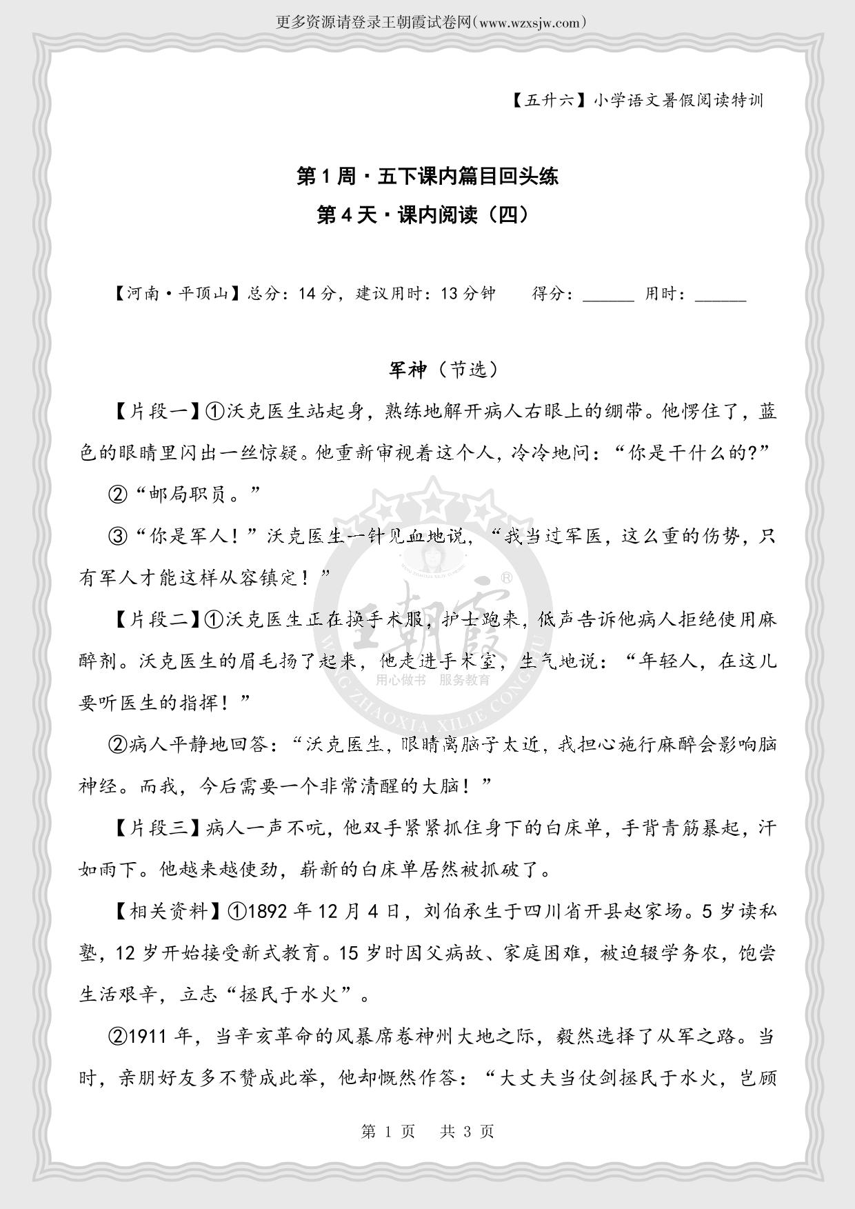 【五升六】小学语文暑假阅读特训第1周第4天 课内阅读(四)