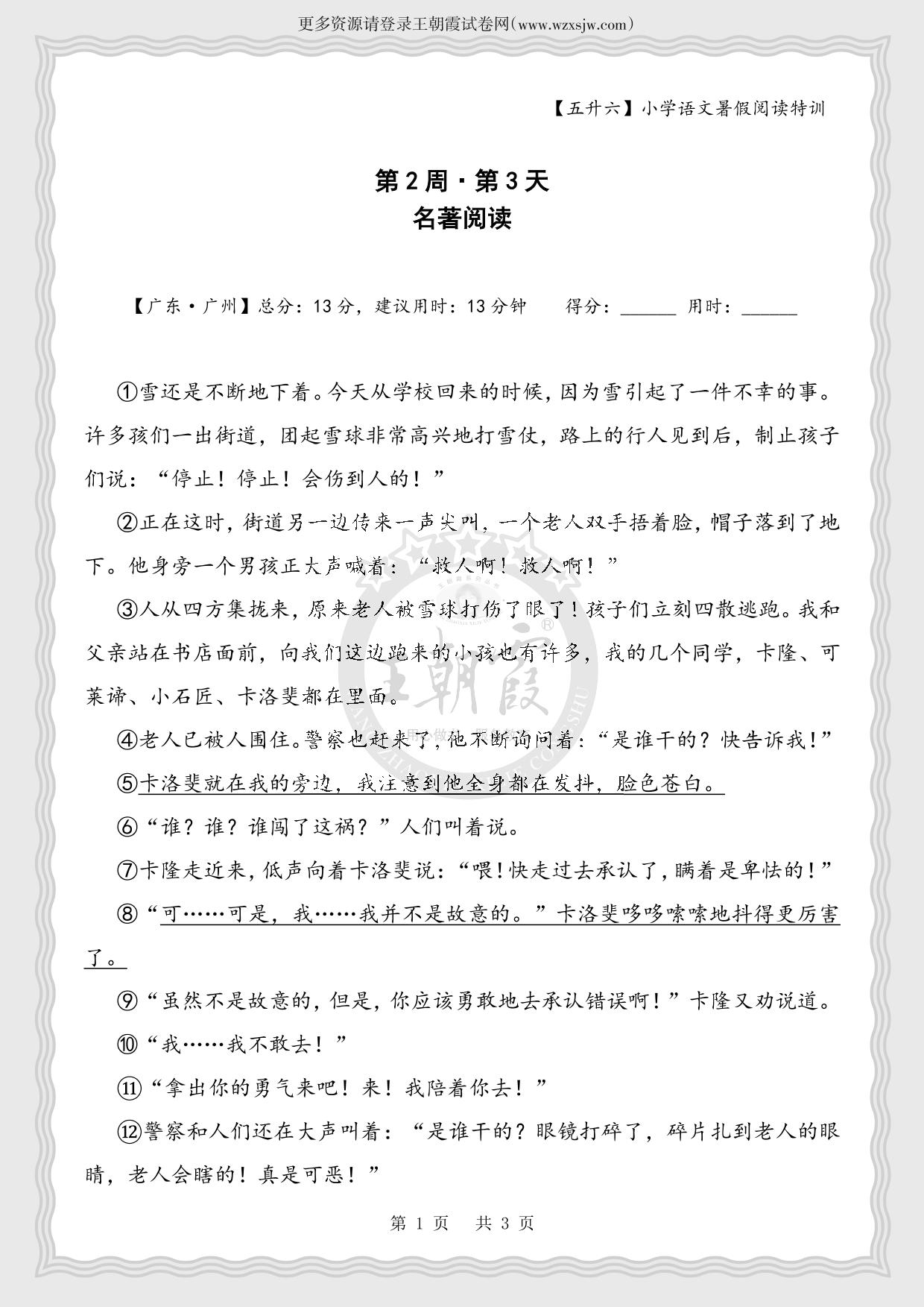 【五升六】小学语文暑假阅读特训第2周第3天 名著阅读