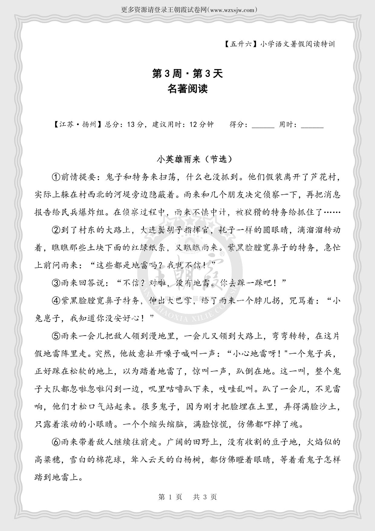 【五升六】小学语文暑假阅读特训第3周第3天 名著阅读