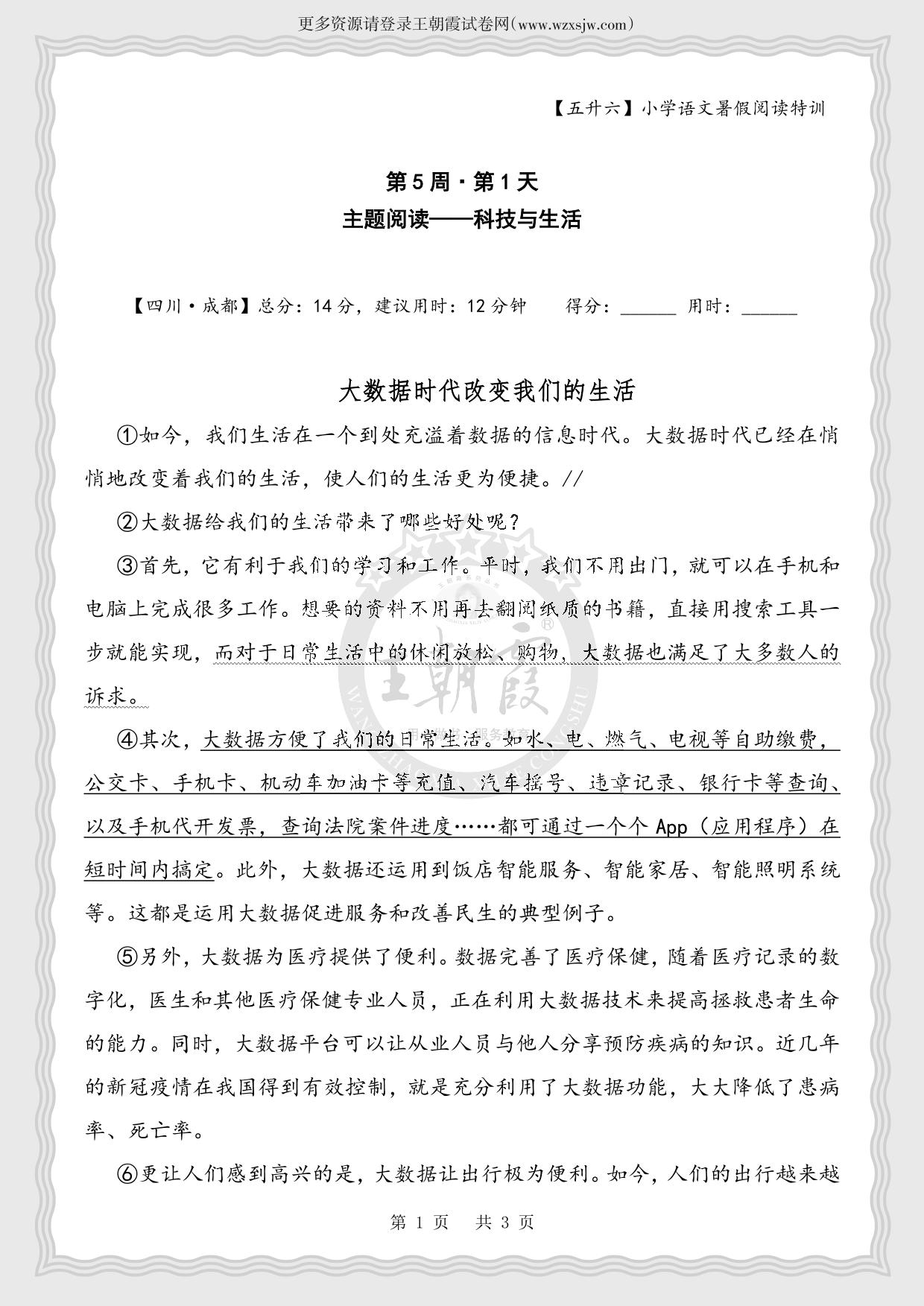 【五升六】小学语文暑假阅读特训第5周第1天 主题阅读 科技与生活