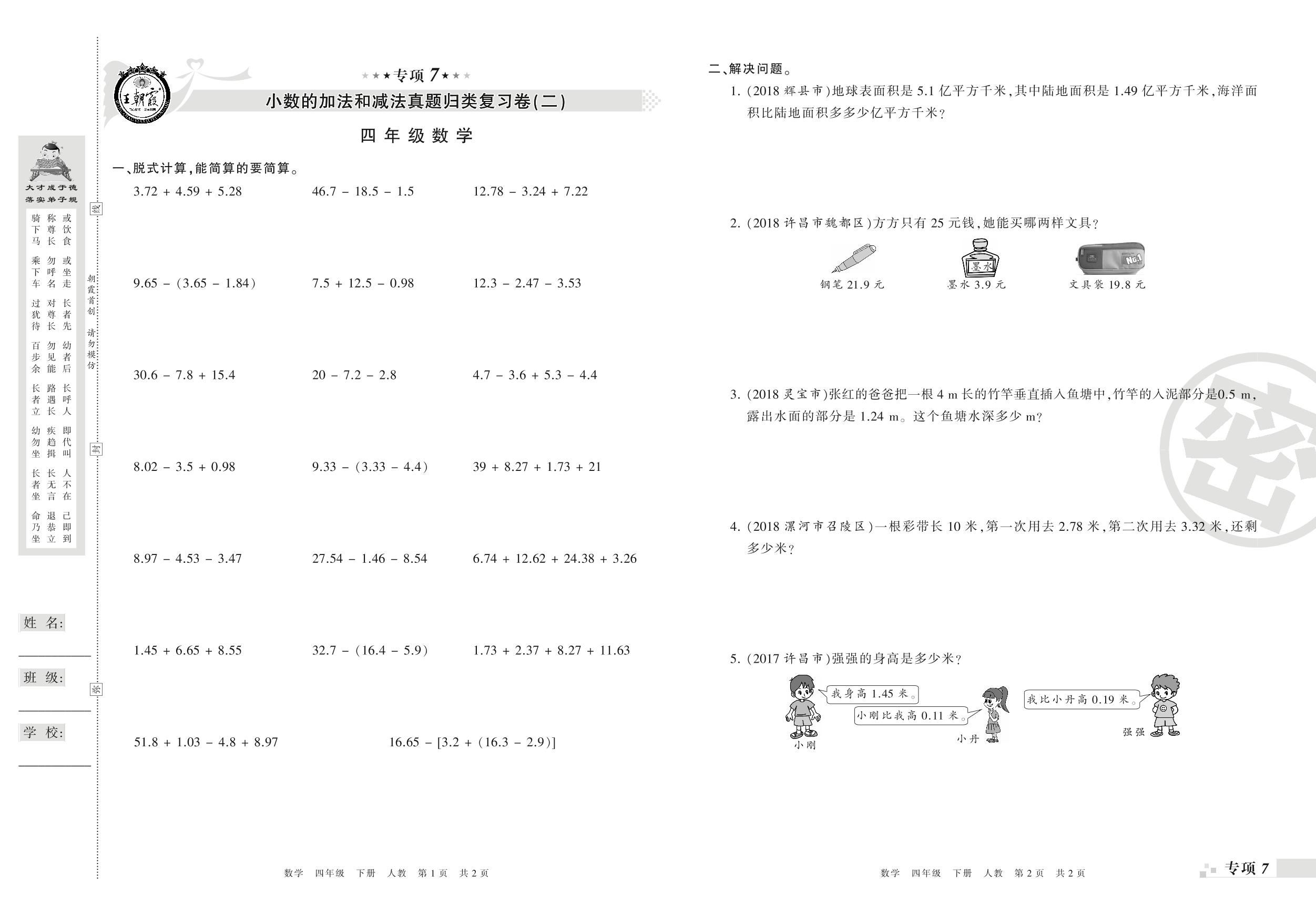 王朝霞期末专项卷——小数的加法和减法(二) 观察物体、平均数与条形统计图及数学广角:鸡兔同笼真题归类复习卷四年级下册数学(人教版)_R210804150620【0】