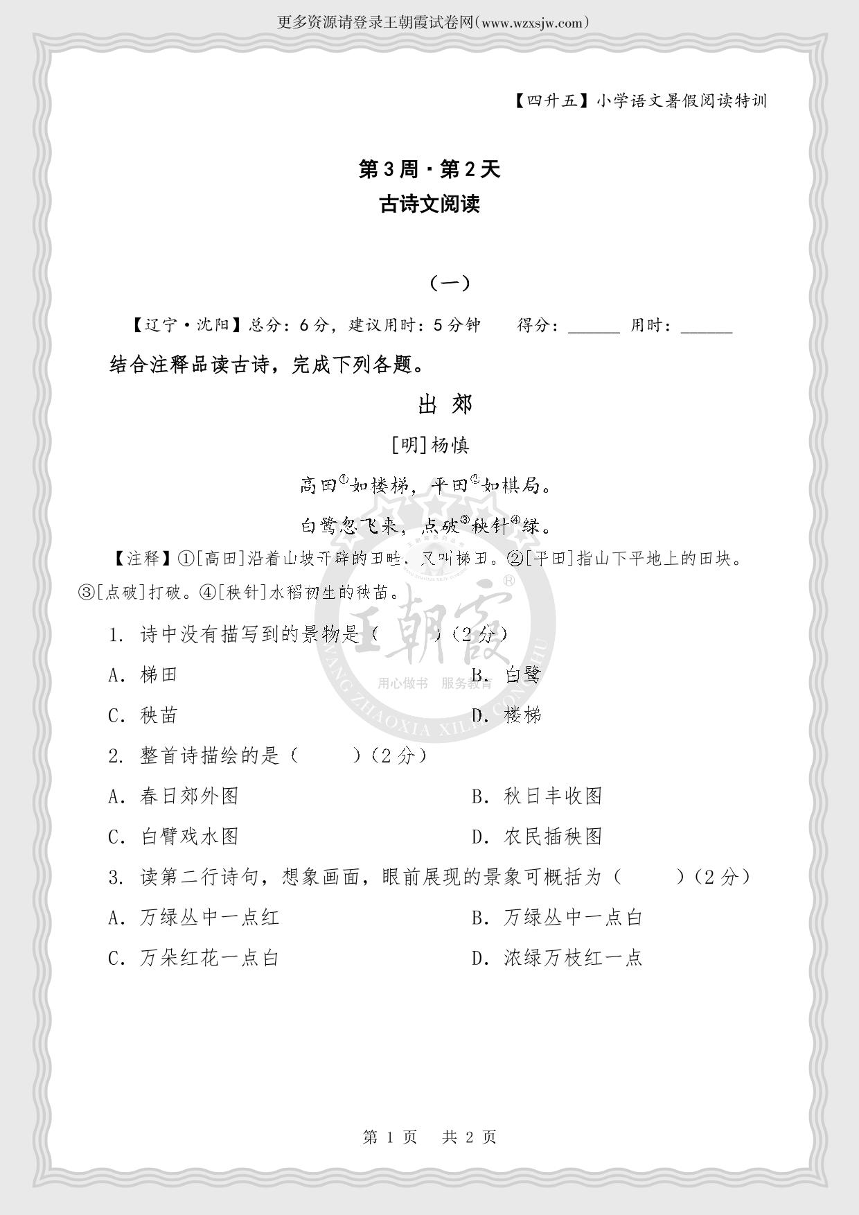 【四升五】小学语文暑假阅读特训第3周第2天 古诗文阅读