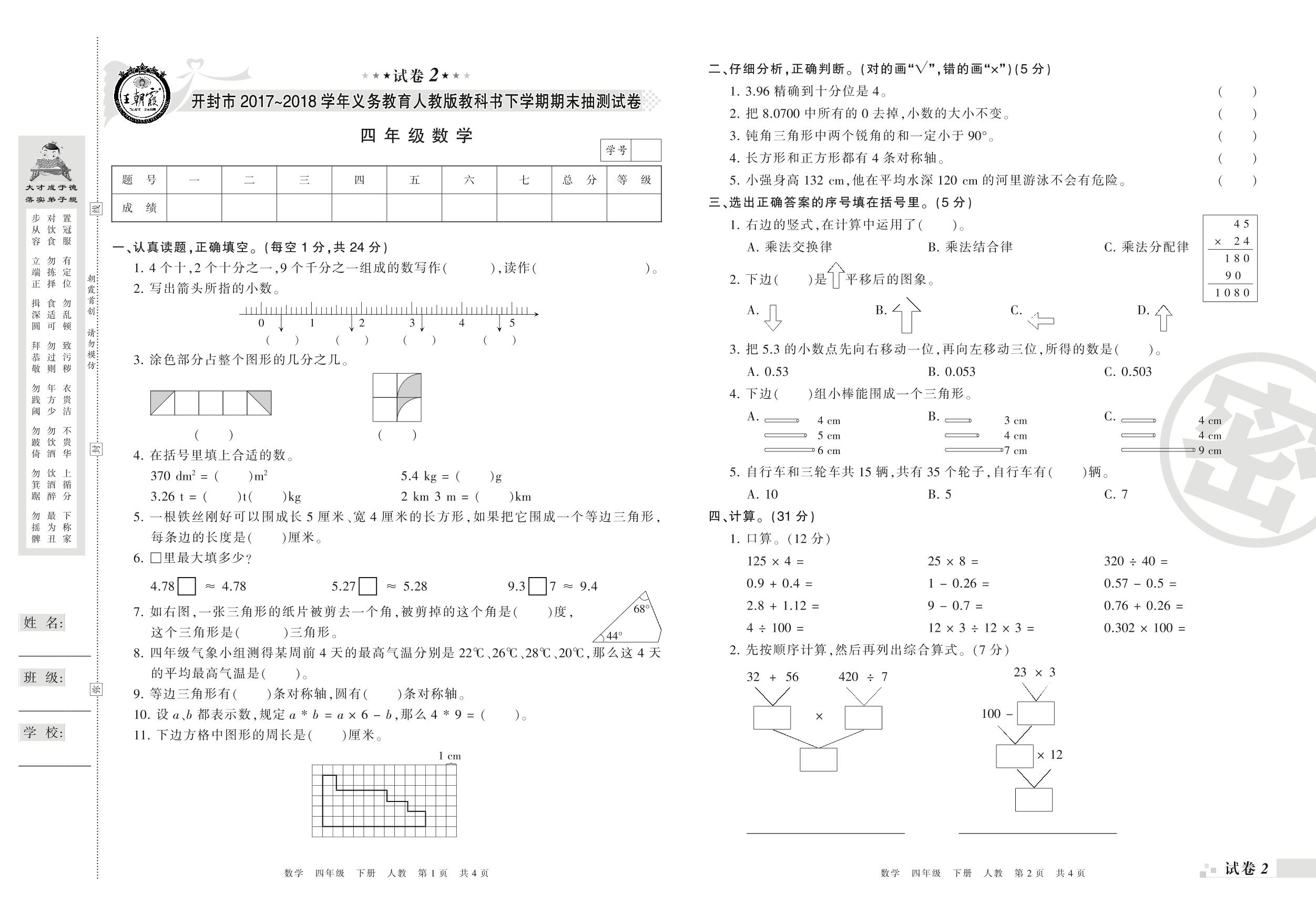2017-2018学年第二学期开封市四年级数学试卷(人教版)【2】