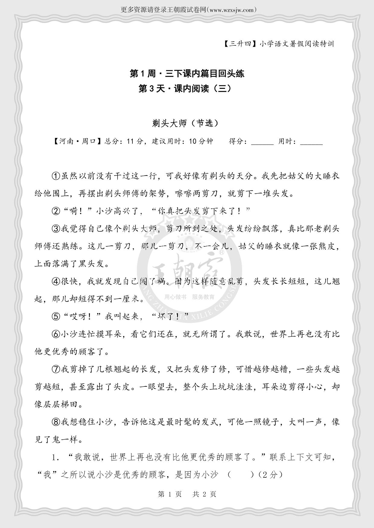 【三升四】小学语文暑假阅读特训第1周第3天 课内阅读(三)