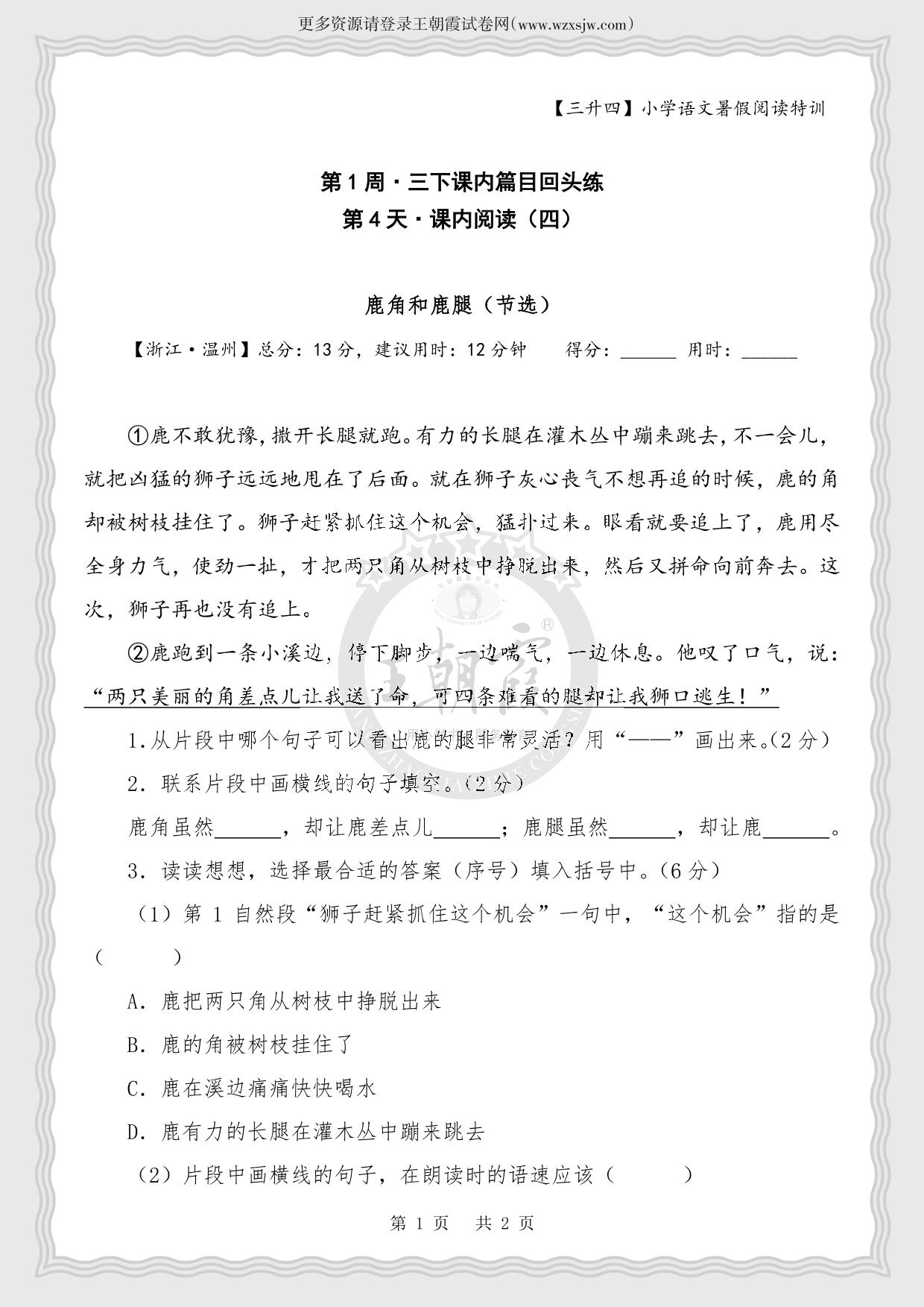 【三升四】小学语文暑假阅读特训第1周第4天 课内阅读(四)