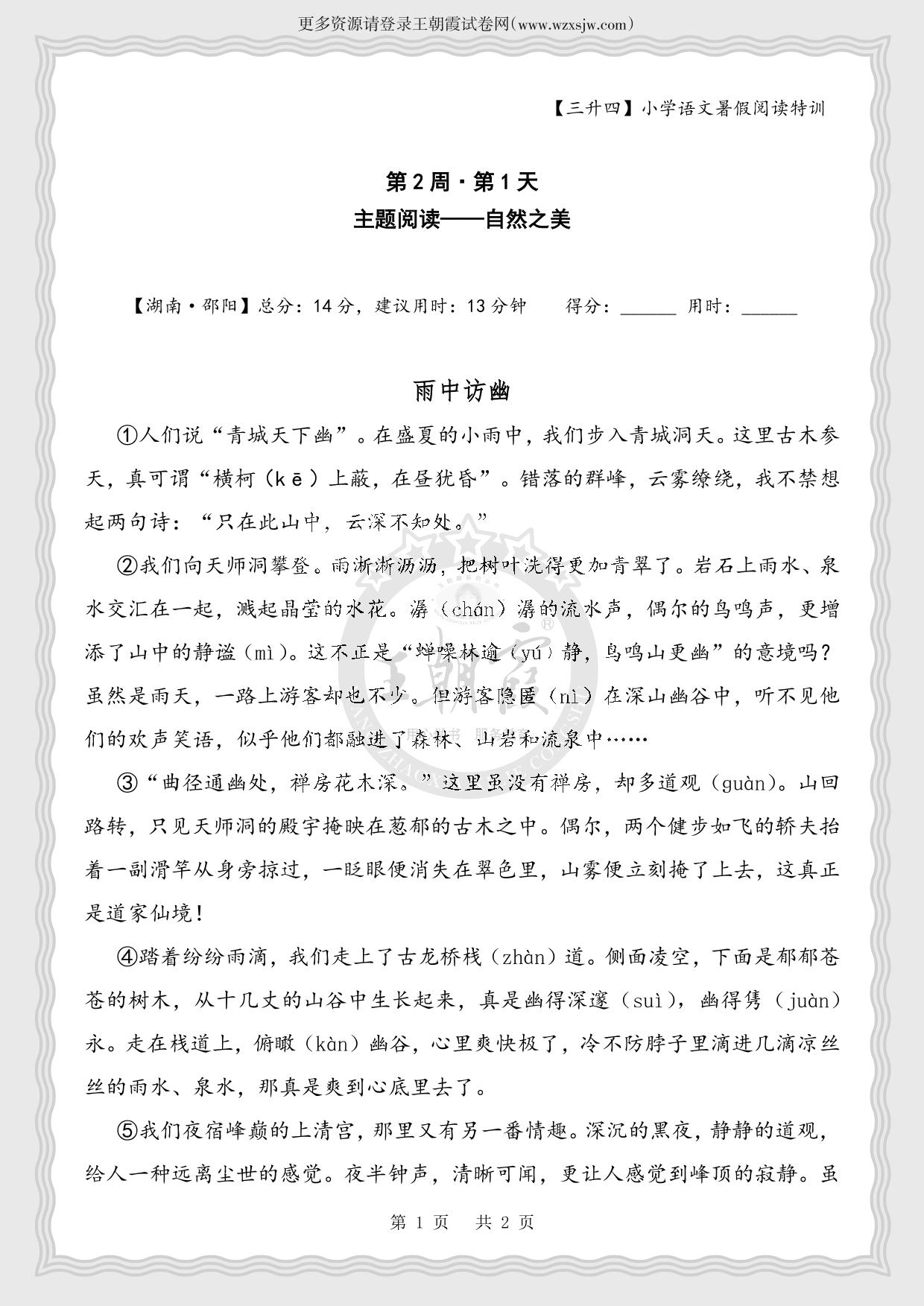 【三升四】小学语文暑假阅读特训第2周第1天 主题阅读 自然之美