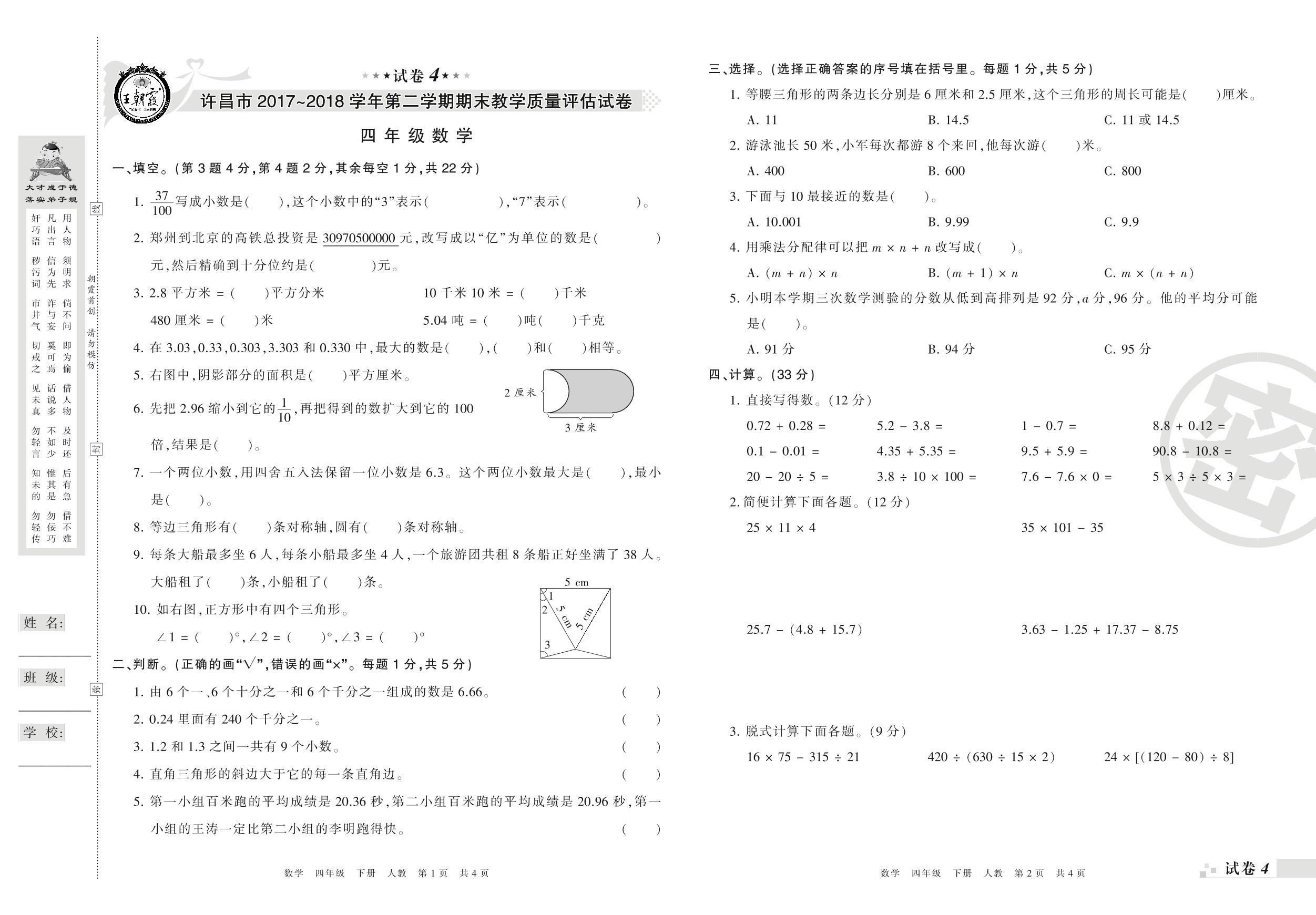 2017-2018学年第二学期许昌市四年级数学试卷(人教版)【4】