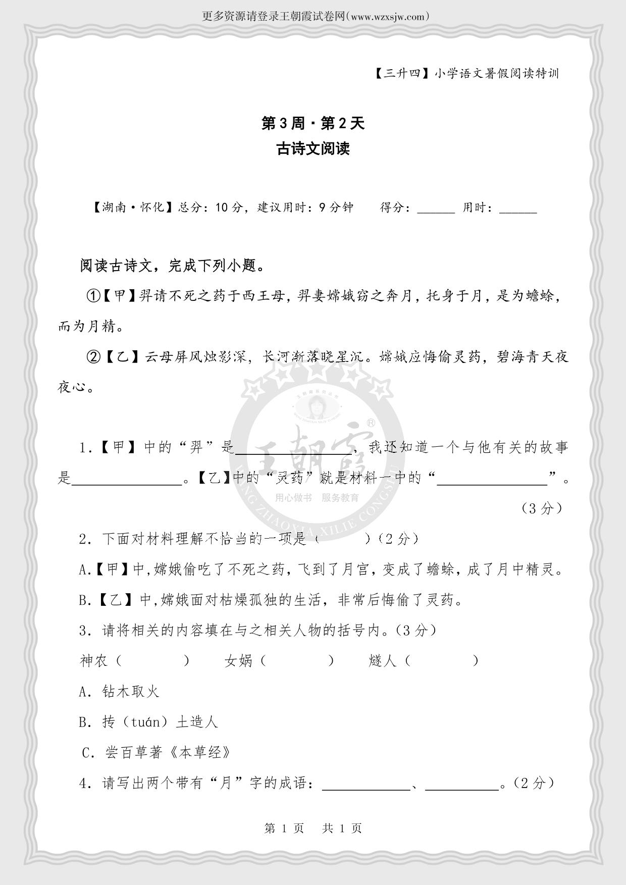 【三升四】小学语文暑假阅读特训第3周第2天 古诗文阅读