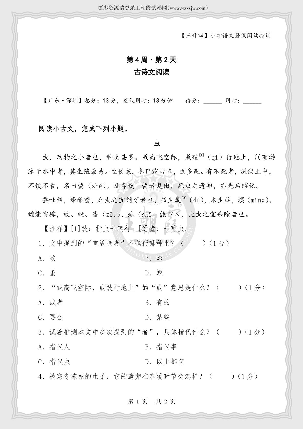 【三升四】小学语文暑假阅读特训第4周第2天 古诗文阅读