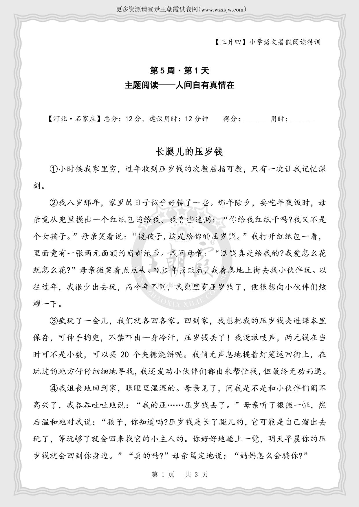 【三升四】小学语文暑假阅读特训第5周第1天 主题阅读 人间自有真情在
