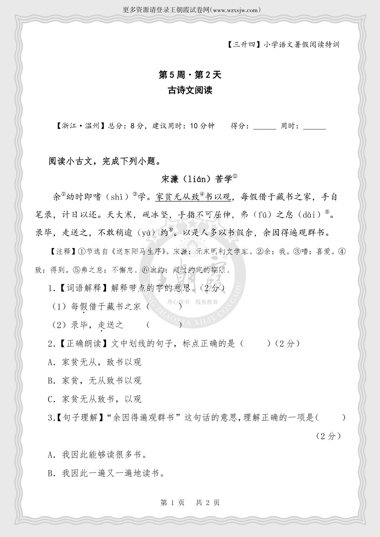 【三升四】小学语文暑假阅读特训第5周第2天 古诗文阅读