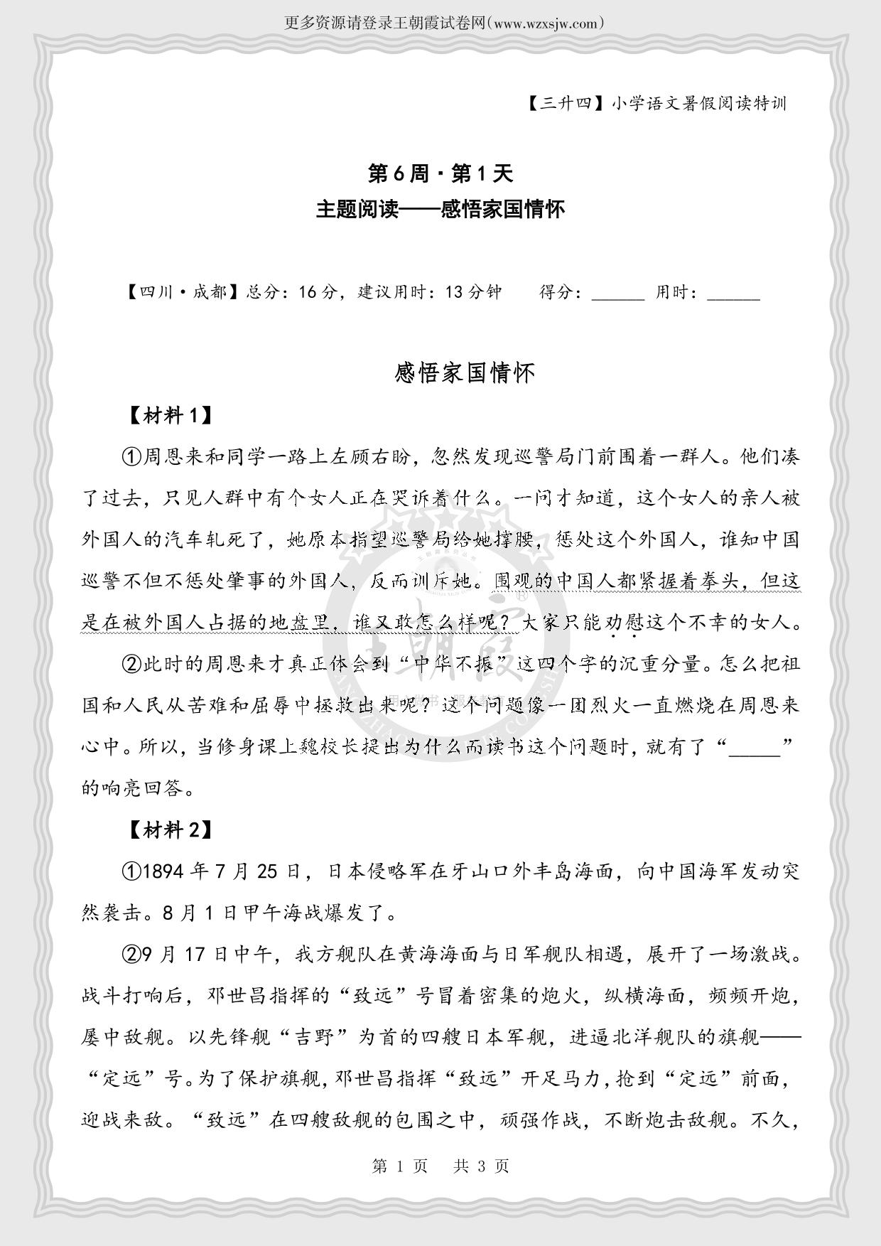【三升四】小学语文暑假阅读特训第6周第1天 主题阅读 感悟家国情怀