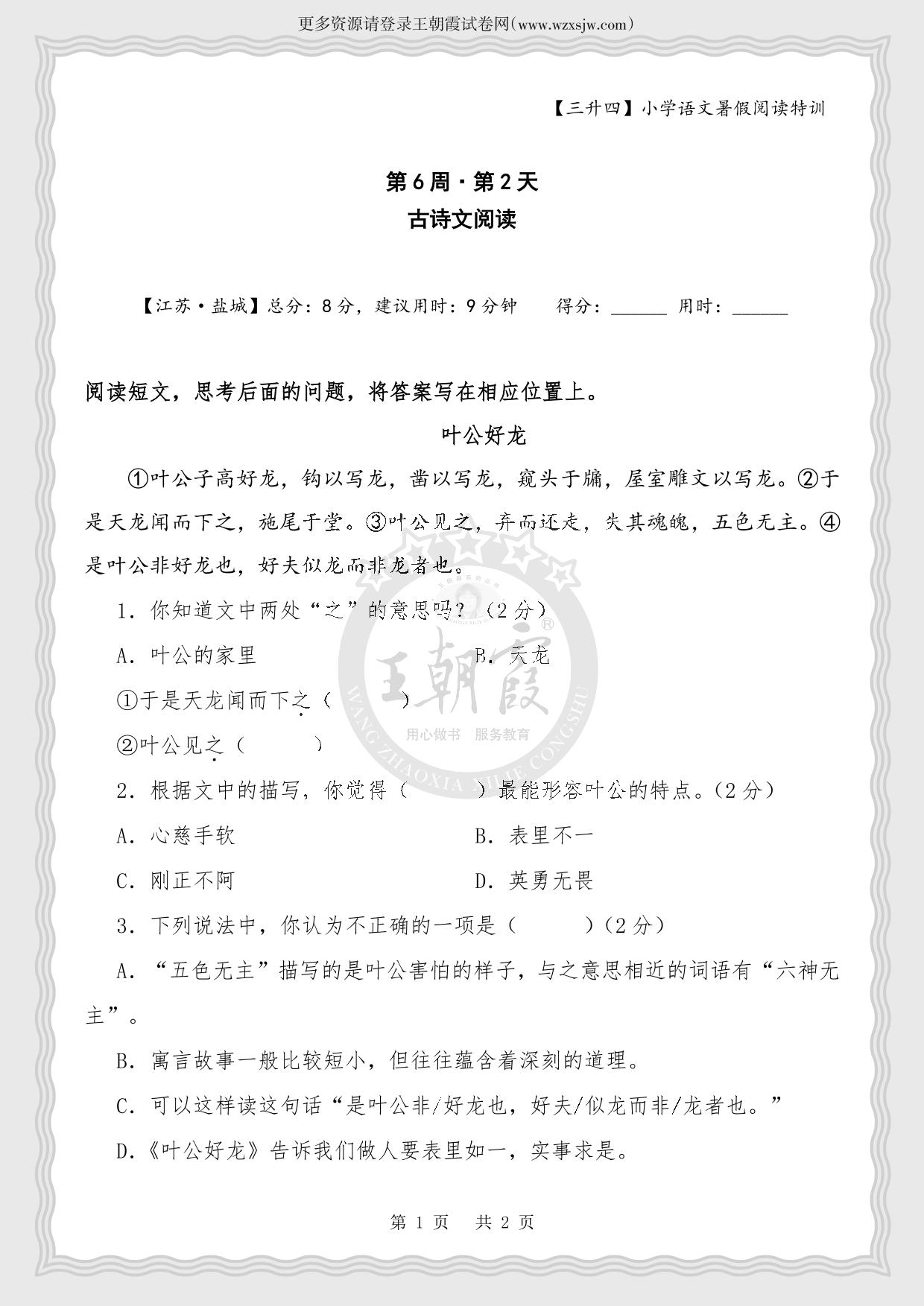 【三升四】小学语文暑假阅读特训第6周第2天 古诗文阅读