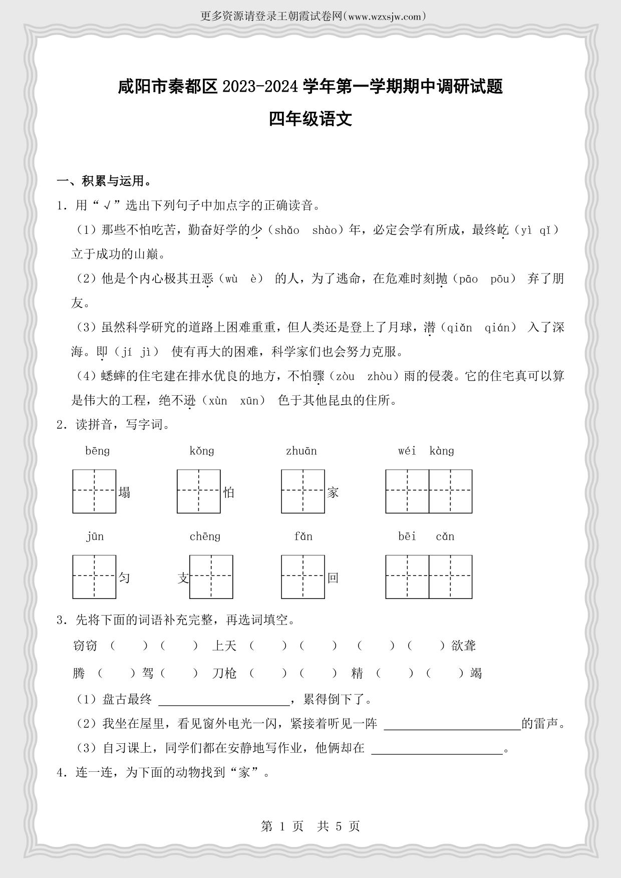 陕西省咸阳市秦都区2023-2024学年第一学期期中调研试题四年级语文(人教版)