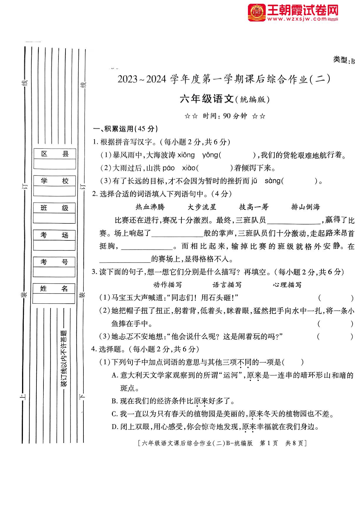 陕西省榆林市神木市第六中学2023-2024学年第一学期课后综合作业(二)(期中)六年级语文(人教版)