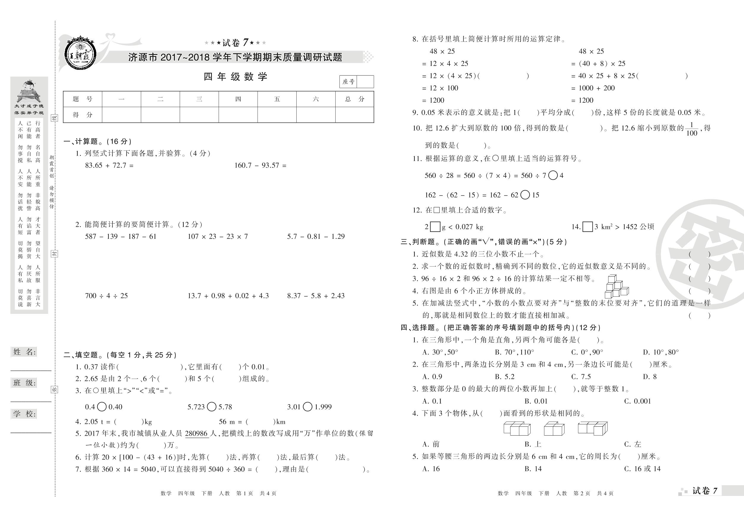 2017-2018学年第二学期济源市四年级数学试卷(人教版)【7】