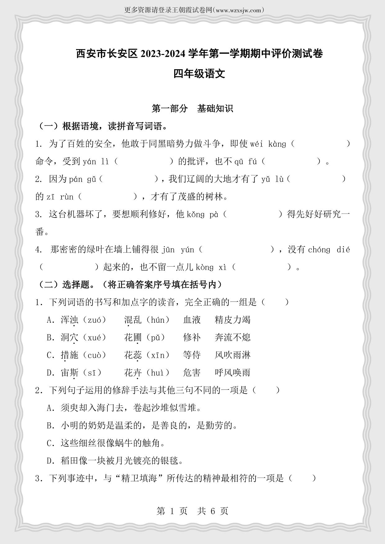 陕西省西安市长安区2023-2024学年第一学期期中评价测试卷四年级语文(人教版)